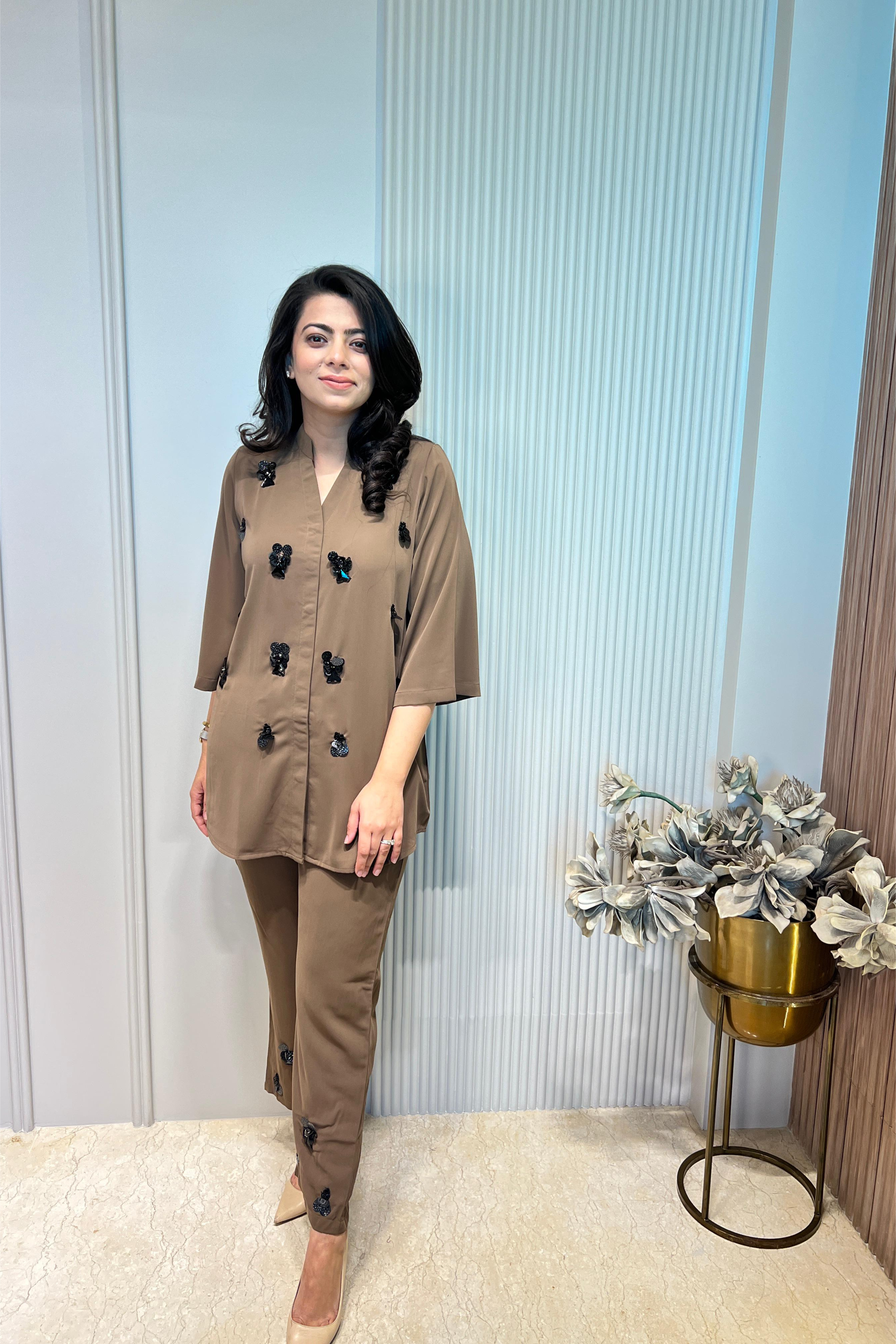 This Brown Mocha Embellished Co-Ord Set, adding a touch of elegance and sophistication. Its versatile design makes it perfect for day-to-night wear, effortlessly transitioning from a casual morning look to an evening ensemble.