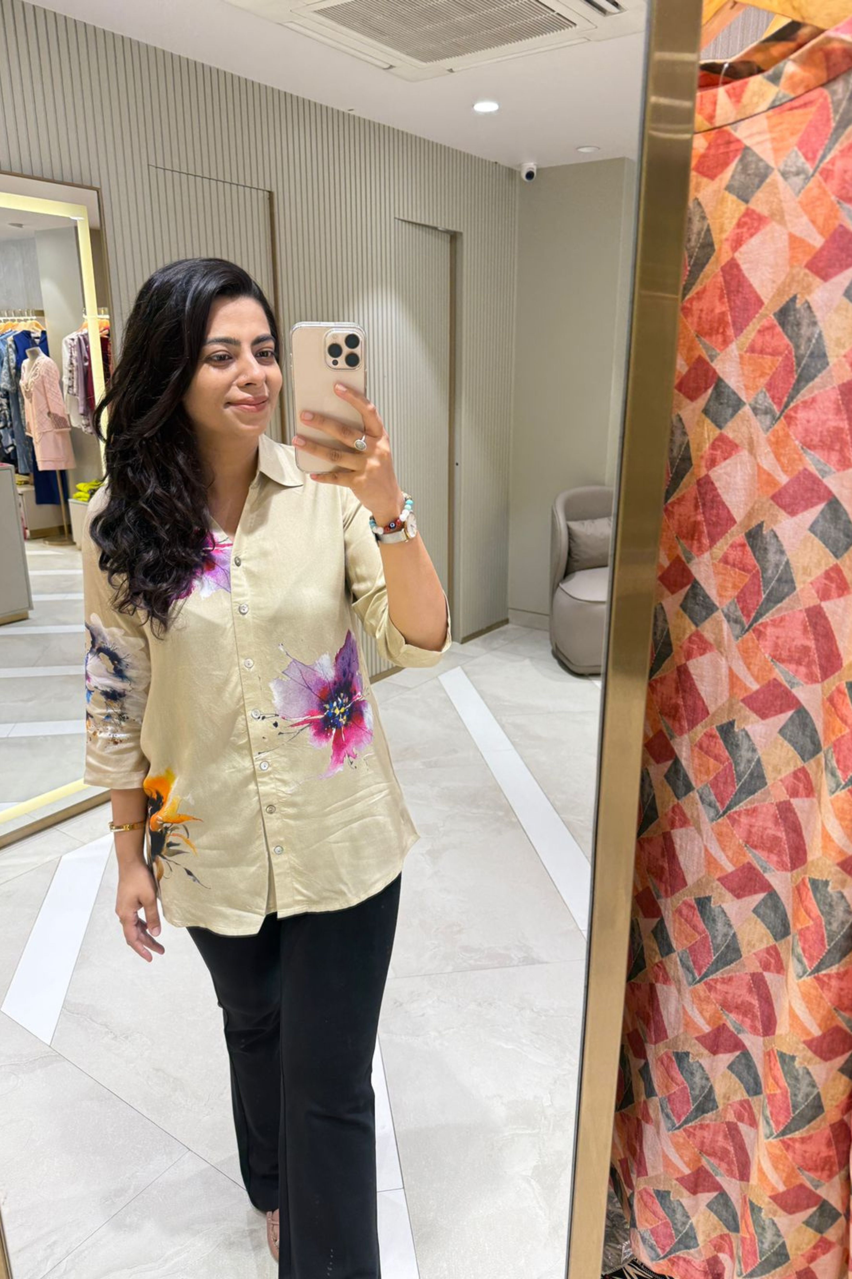 ASHIN's Beige Floral Printed Shirt blends elegance and comfort with its soft, breathable fabric and delicate flower print. Perfect for casual outings or semi-formal occasions, this timeless shirt adds a fresh, stylish touch to your wardrobe. Pair it effortlessly with denims or trousers for a chic look.