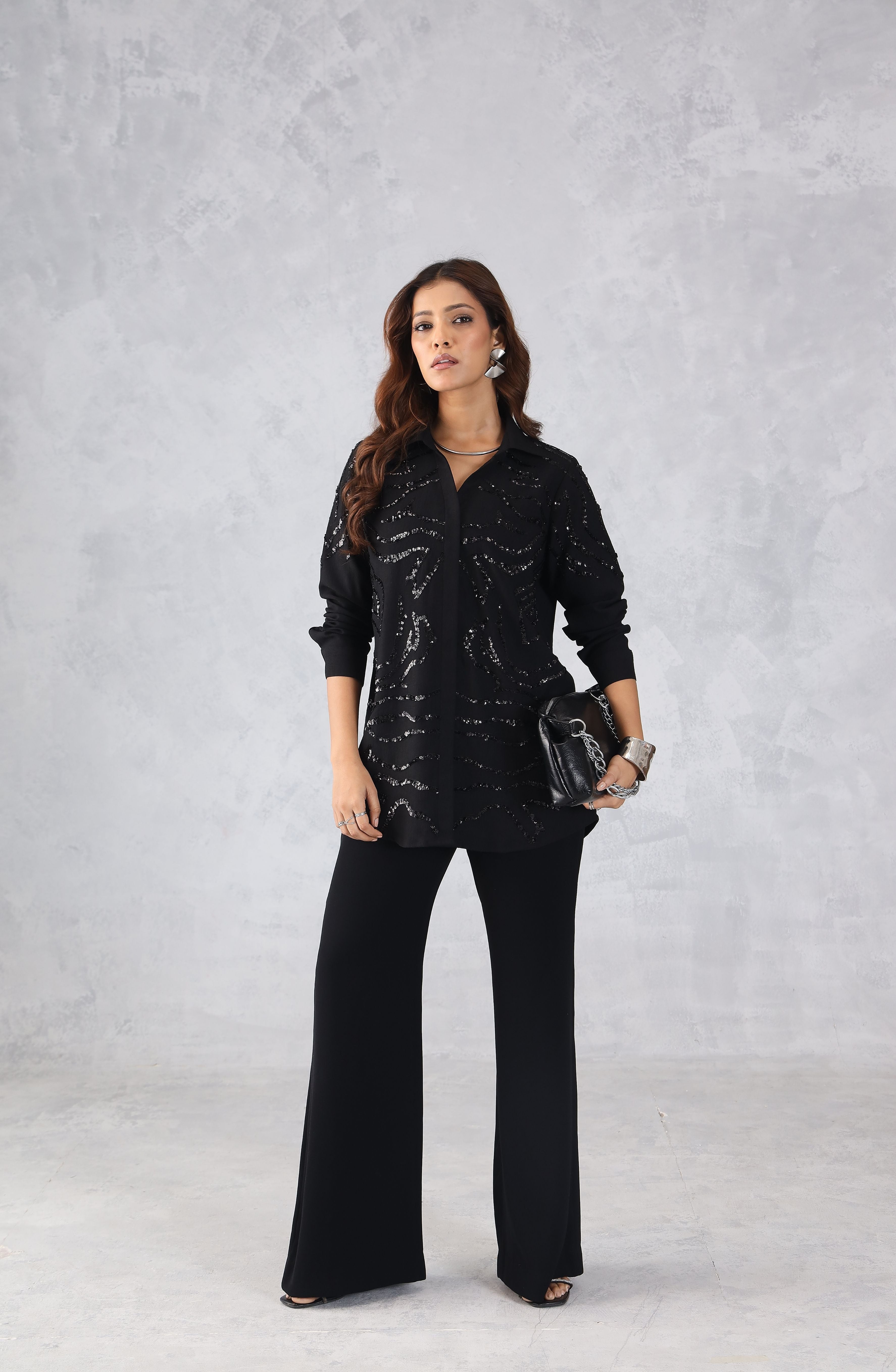 ASHIN’s Black Abstract Embellished Shirt features subtle shimmer embellishment arranged in a modern abstract pattern on a classic black base. Designed for comfort and style, it’s perfect for evening outings, dinner plans, and elegant semi-formal wear.