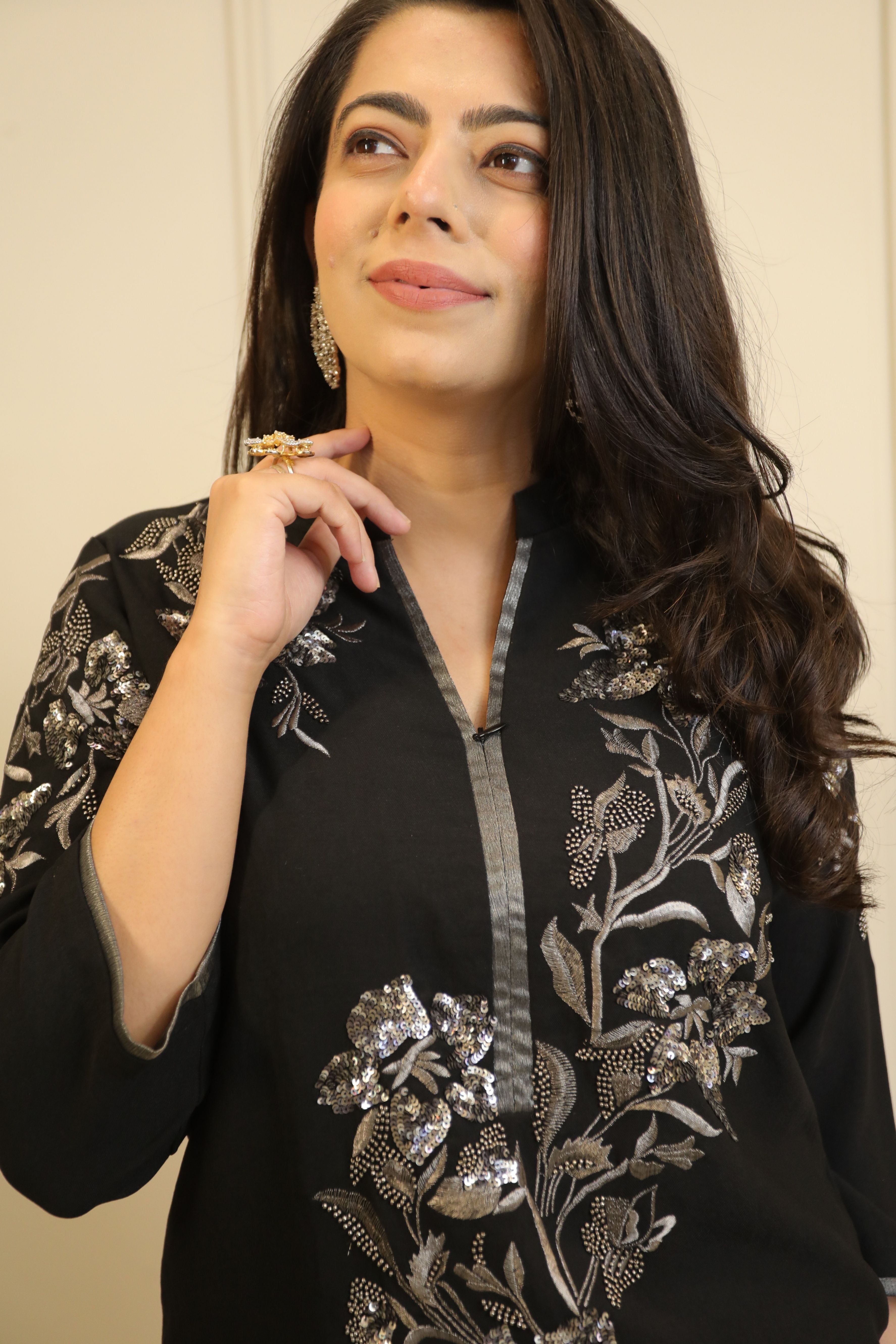This black co-ord set has beautiful silver floral embellishment that looks super classy. It’s perfect for parties, weddings, or festivals. The fabric is comfortable, and the design makes you look dressed up without trying too hard.