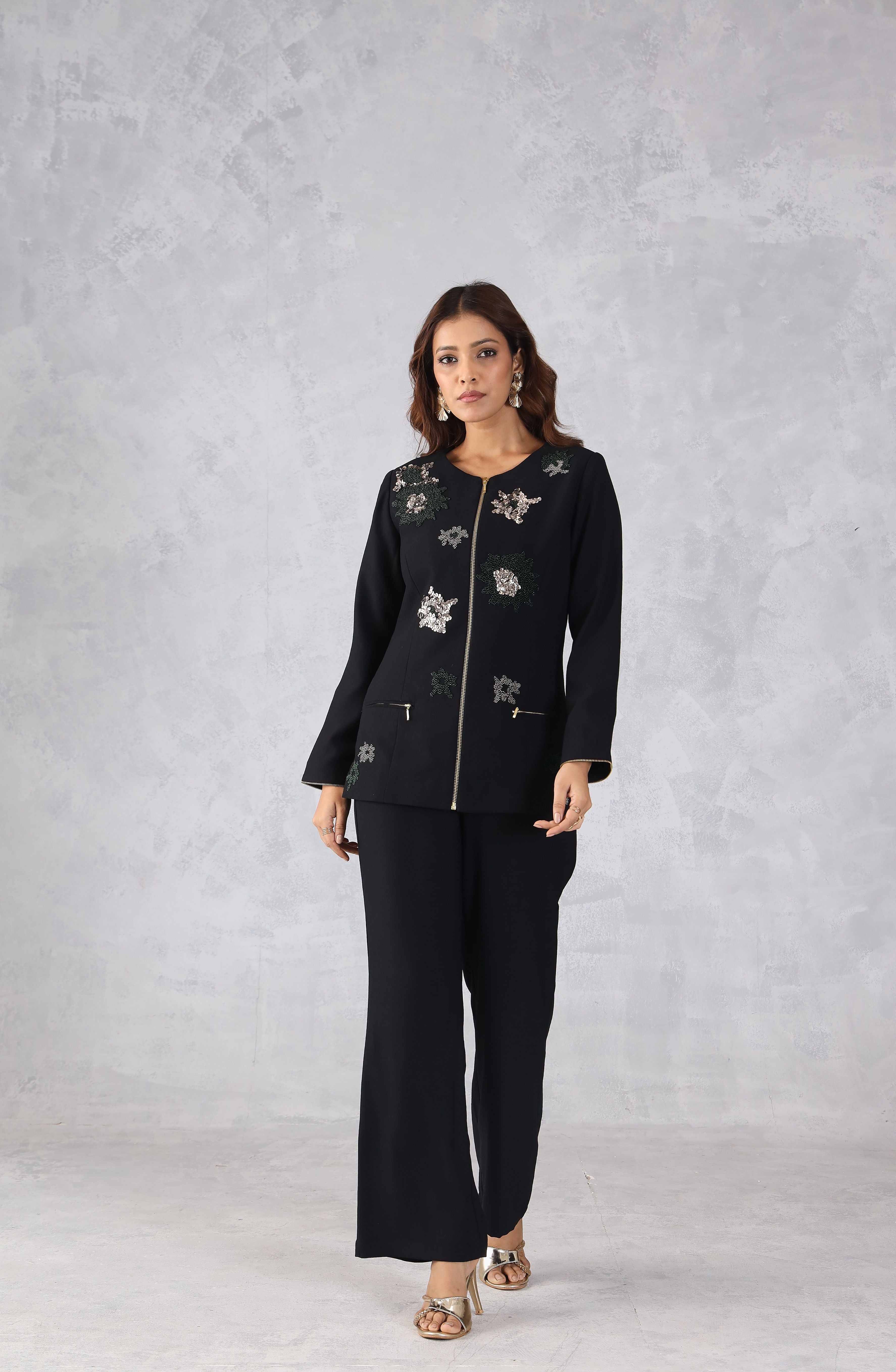This Black Embellished Zip-Front Co-Ord Set gives a stylish and classy look with its pretty floral designs and comfortable fit. Perfect for parties, office wear, or any special occasion, this Ashin outfit blends elegance and everyday ease.