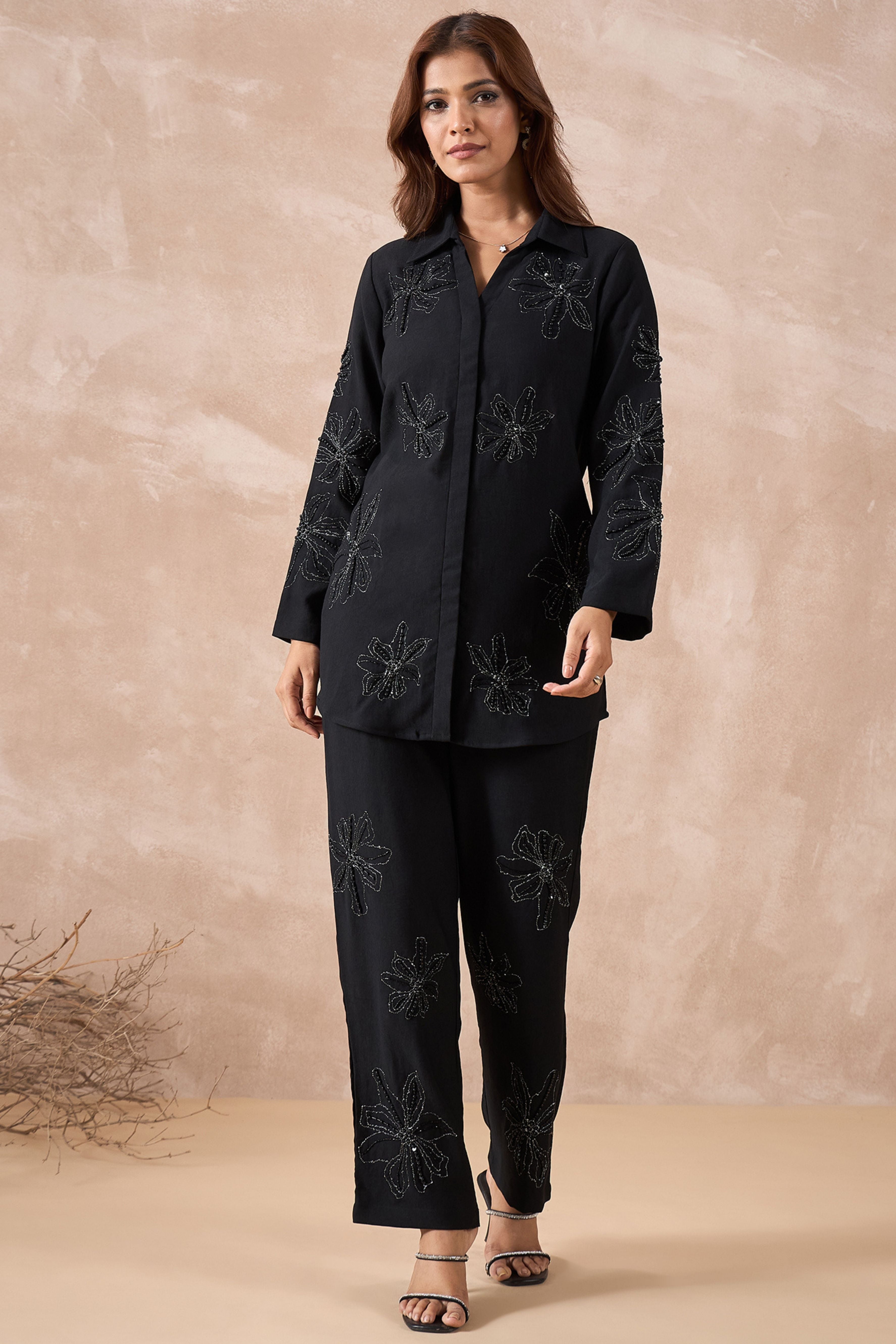 Step up your style with this Black Floral Embellished Co-Ord Set. Made from soft and comfy fabric, it has pretty hand-done floral designs that make it perfect for small functions, outings, or everyday wear with a stylish touch.