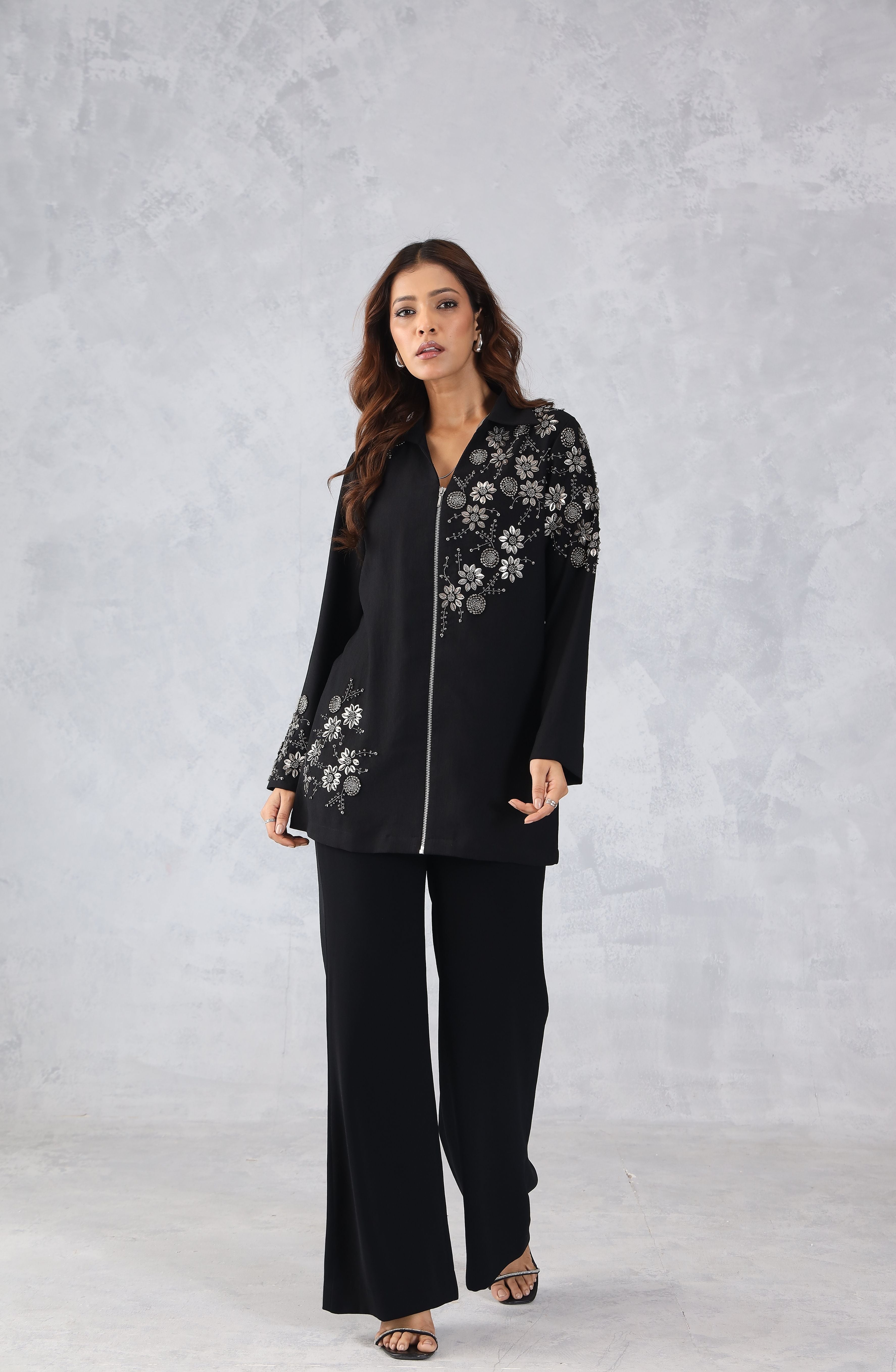 ASHIN’s Black Floral Embellished Zip Style Shirt is crafted in soft, comfortable fabric with elegant floral handwork. The front zip adds a modern touch, making it perfect for semi-formal outings, evening dinners, and stylish day wear.