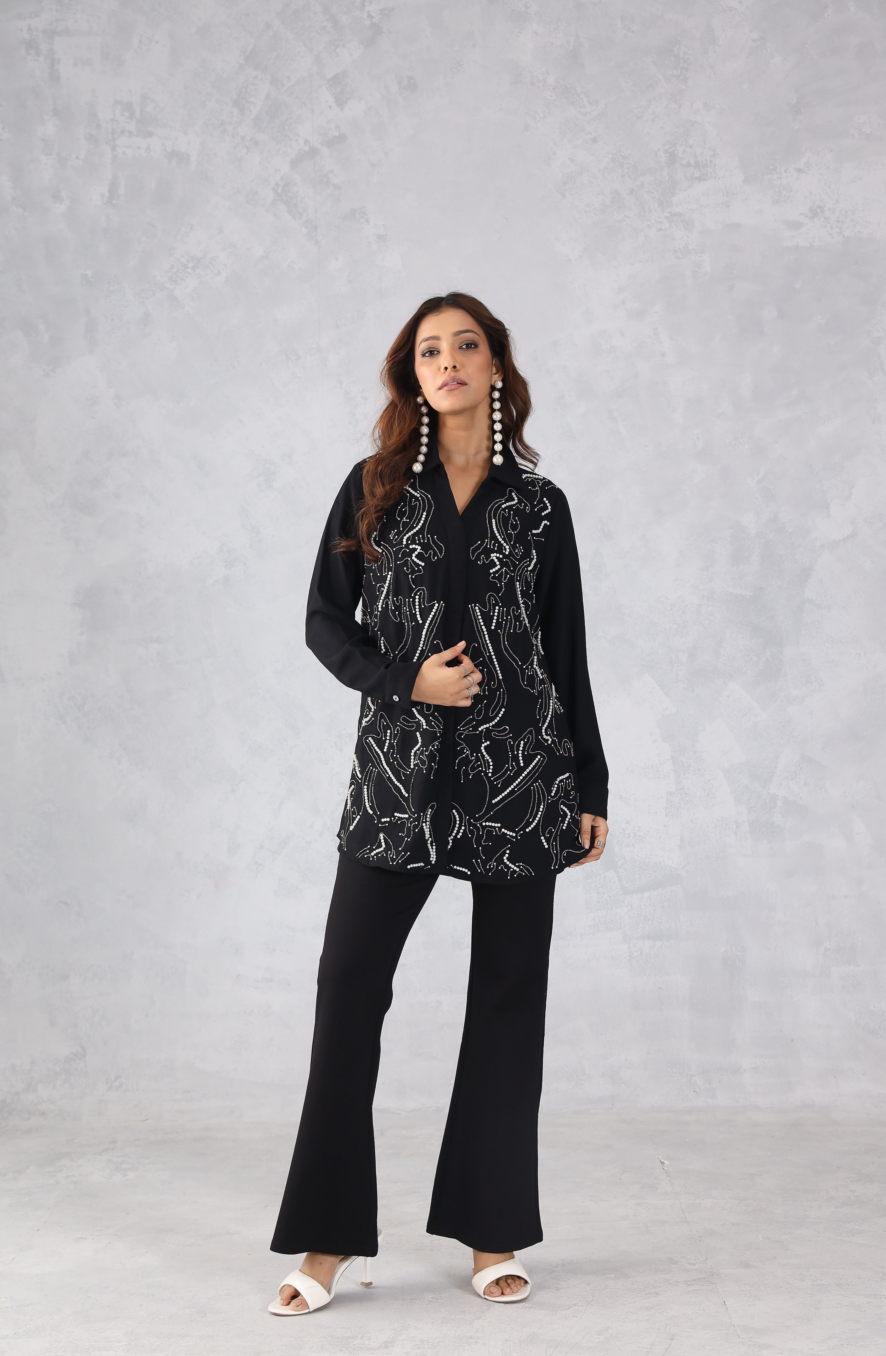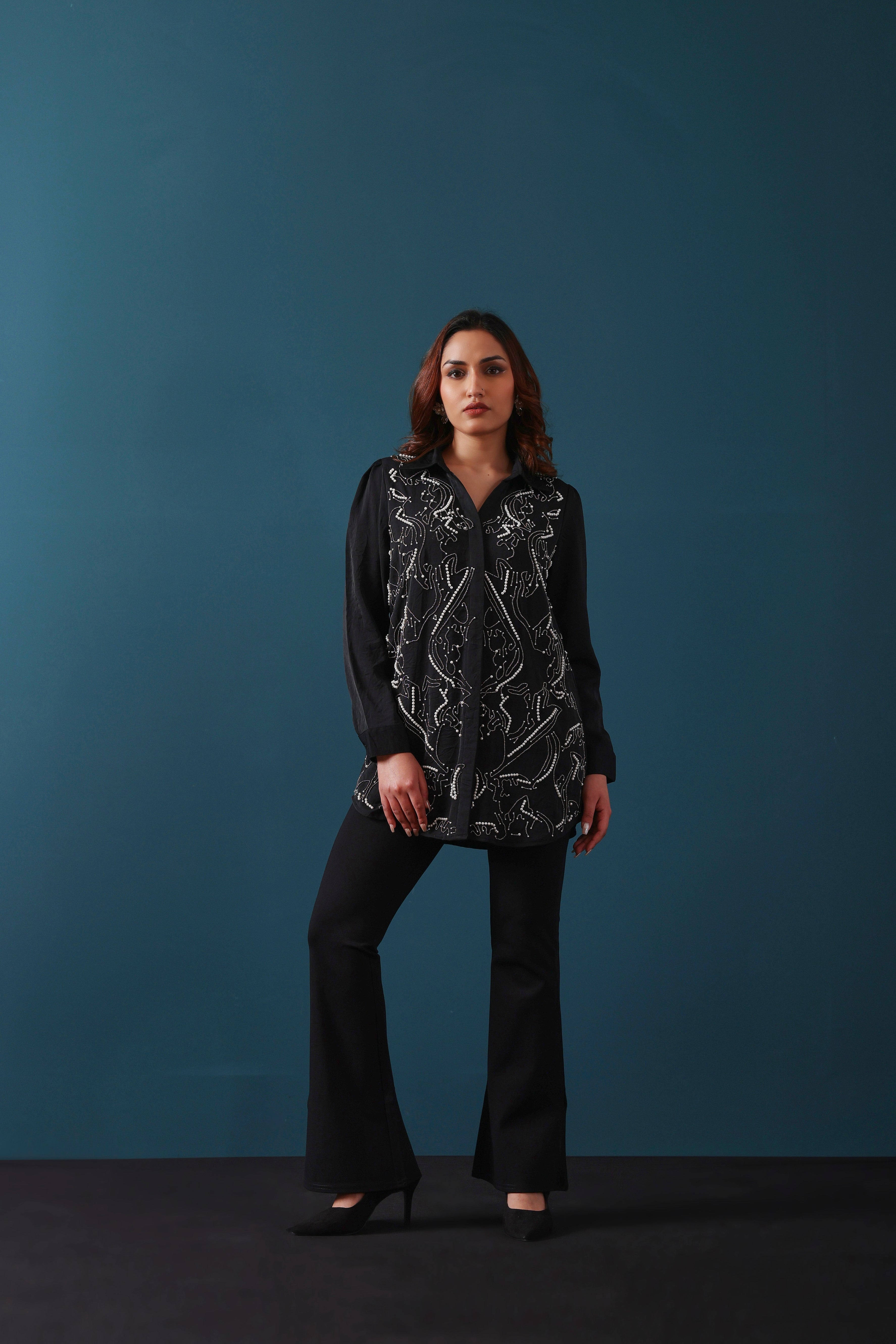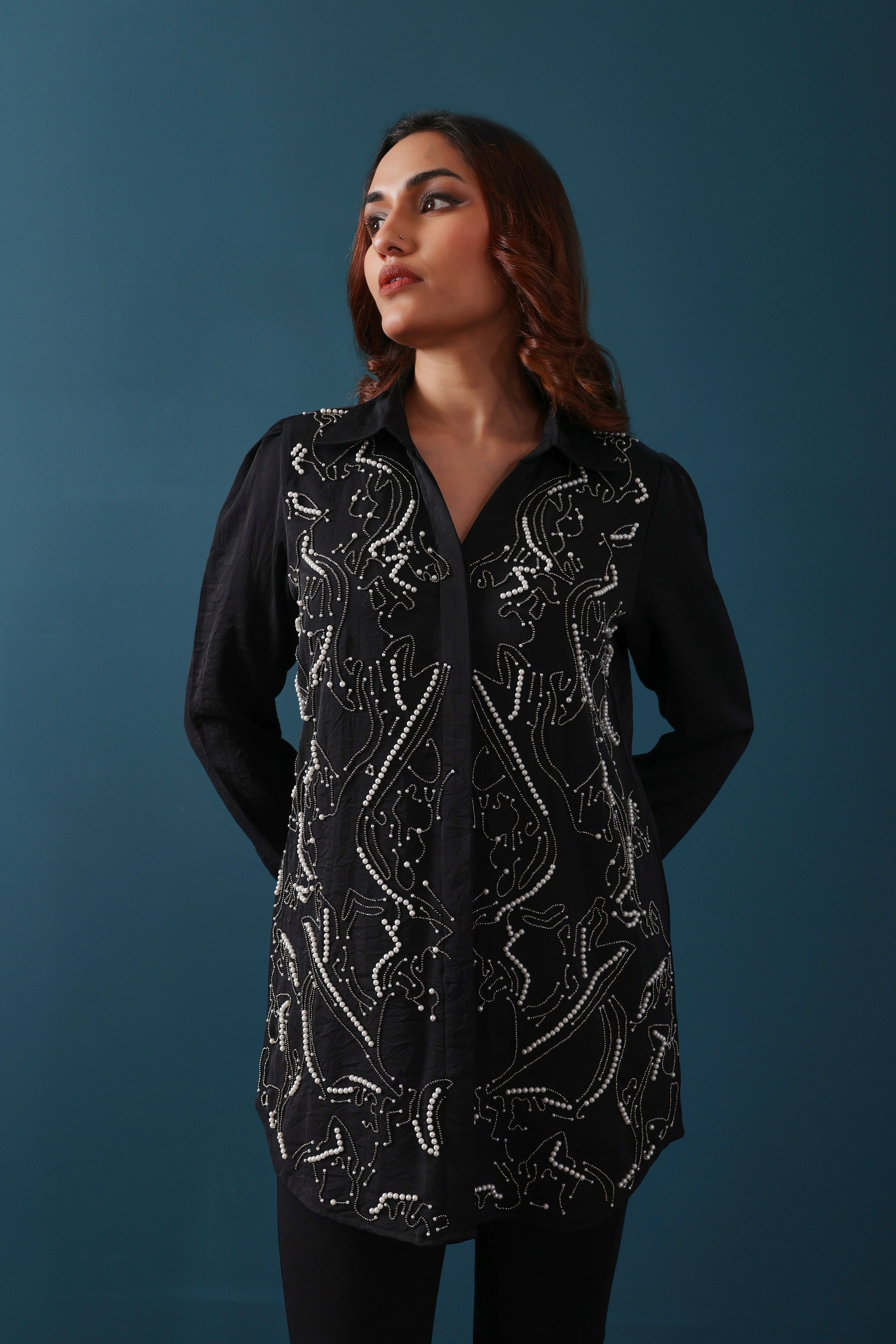 Crafted from luxurious georgette rayon fabric, the Black & Pearl Embellished Shirt is designed to elevate your formal wardrobe with its intricate pearl embellishments throughout, adding a touch of sophistication. The shirt's heavy yet elegant design makes it perfect for special occasions, while the breathable fabric ensures comfort, making it suitable for year-round wear.
