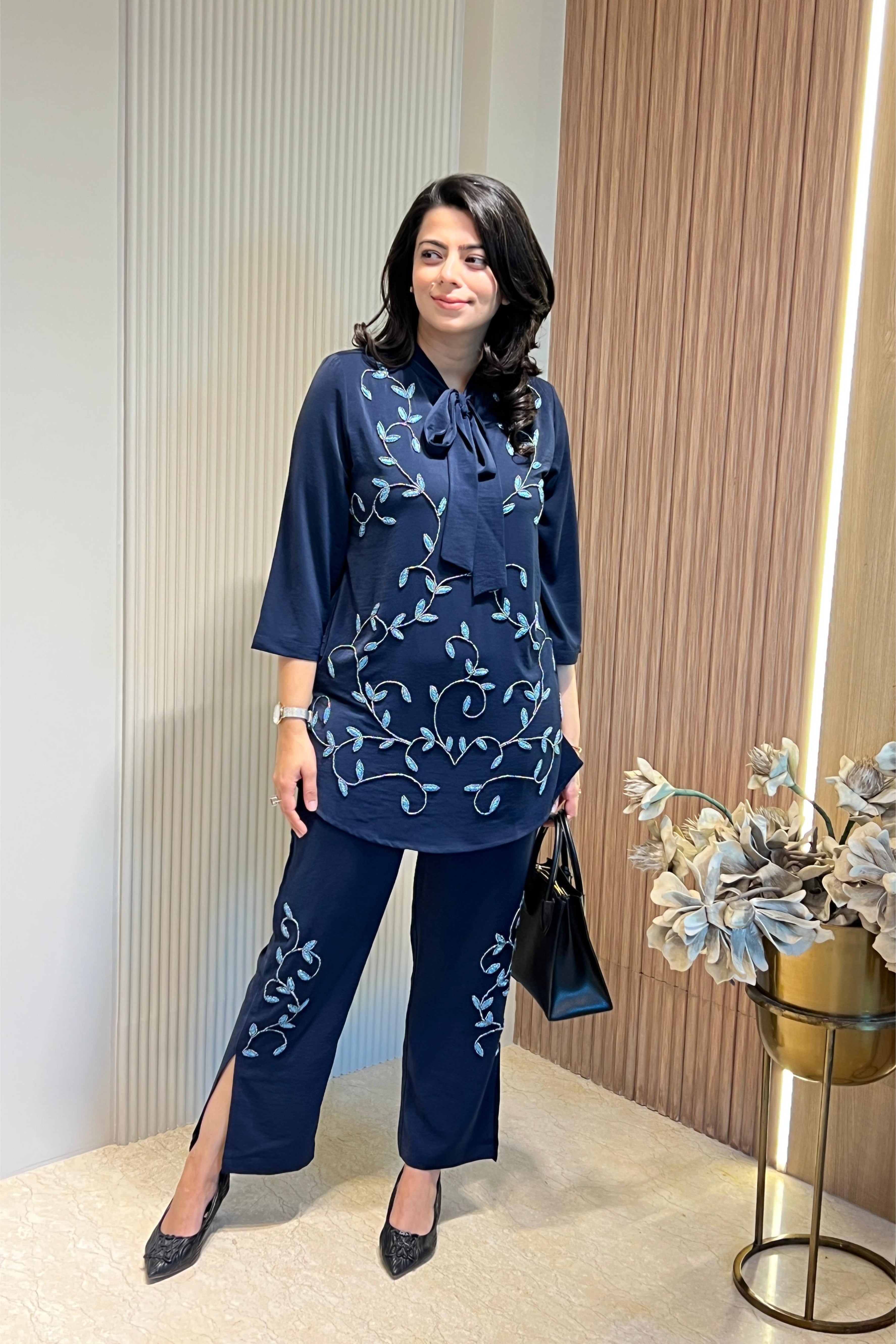 Make a style statement with this blue embellished co-ord set, crafted from lightweight georgette rayon for a comfortable yet chic look. The set features a knot-style top with delicate light blue handwork, while the matching pants are adorned with intricate hand detailing throughout. Perfect for any special occasion, this co-ord set combines elegance and unique craftsmanship, bringing effortless sophistication to your wardrobe.
