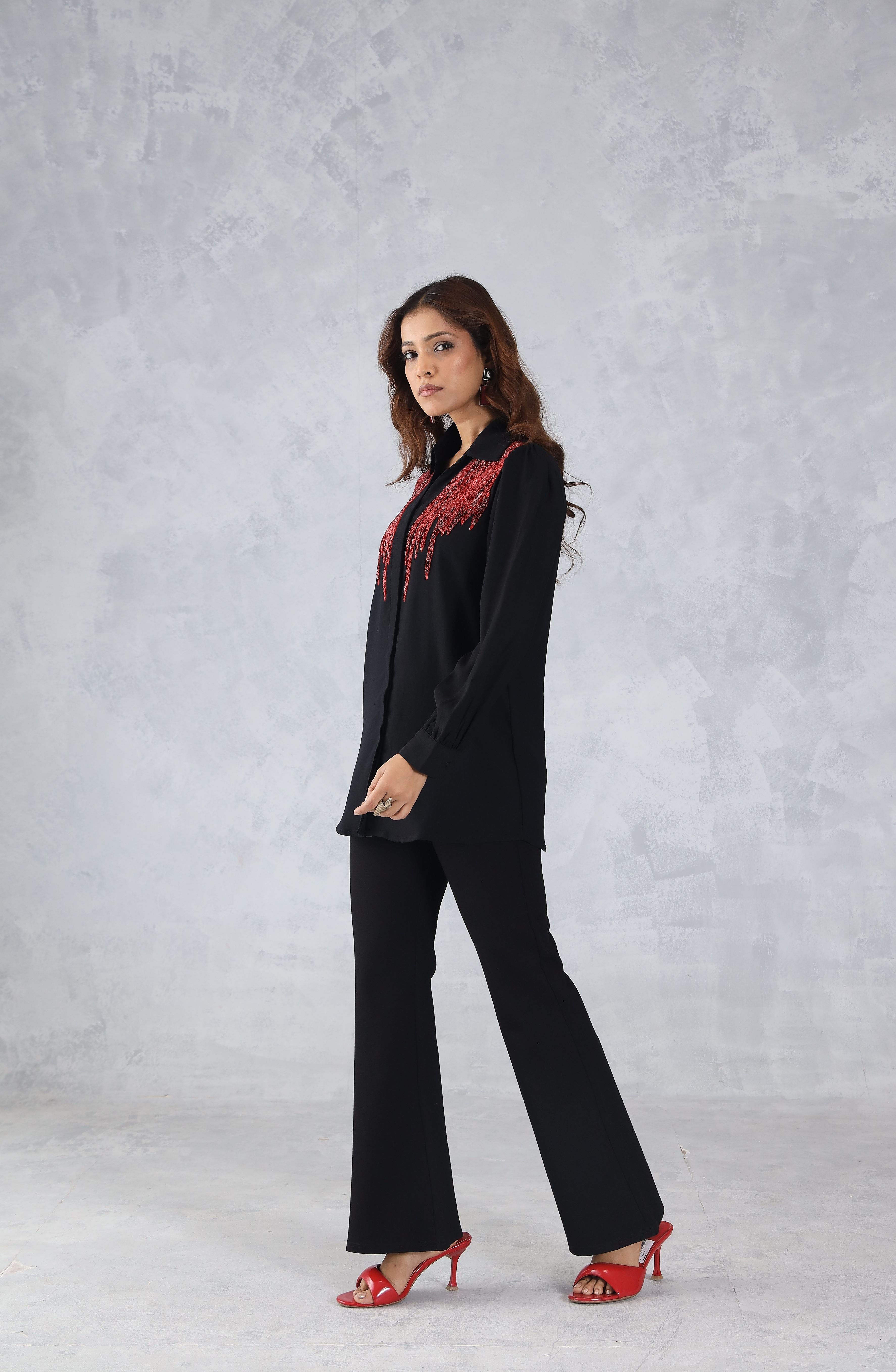 ASHIN’s Bold Black & Red Embellished Shirt features striking red embellishment on a deep black base, creating a powerful statement look. Designed for comfort and style, it’s perfect for evening dinners, parties, and confident night outings.