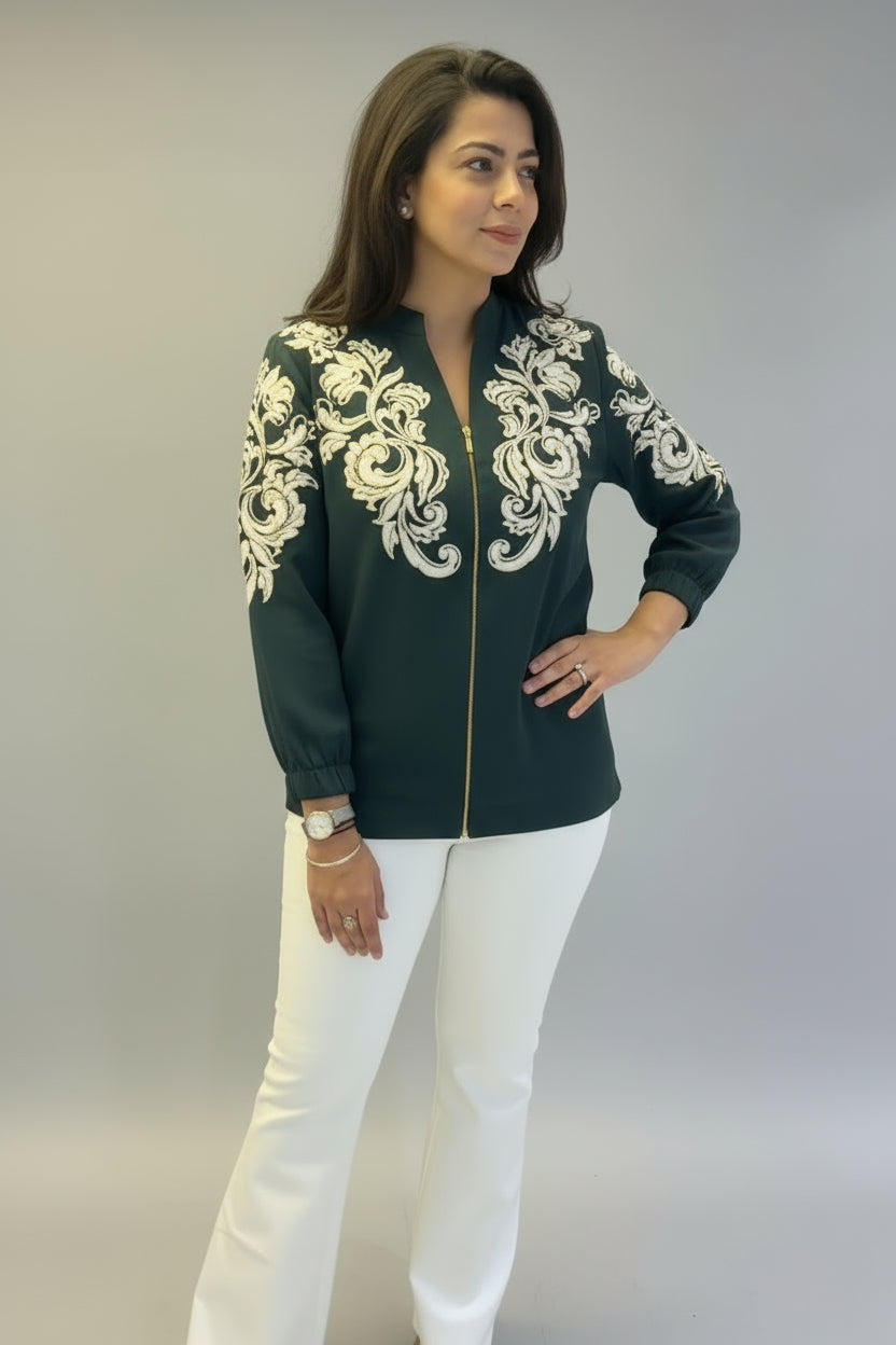 Bottle green jacket is crafted from a blend of georgette, rayon, and lycra, giving it a super-soft feel and comfortable fit. Featuring stylish rexin embroidery, a convenient zipper closure, and elastic on the sleeves, it’s a versatile addition to your wardrobe. Ideal for year-round wear (except during peak summer), this jacket effortlessly combines comfort with a modern look.