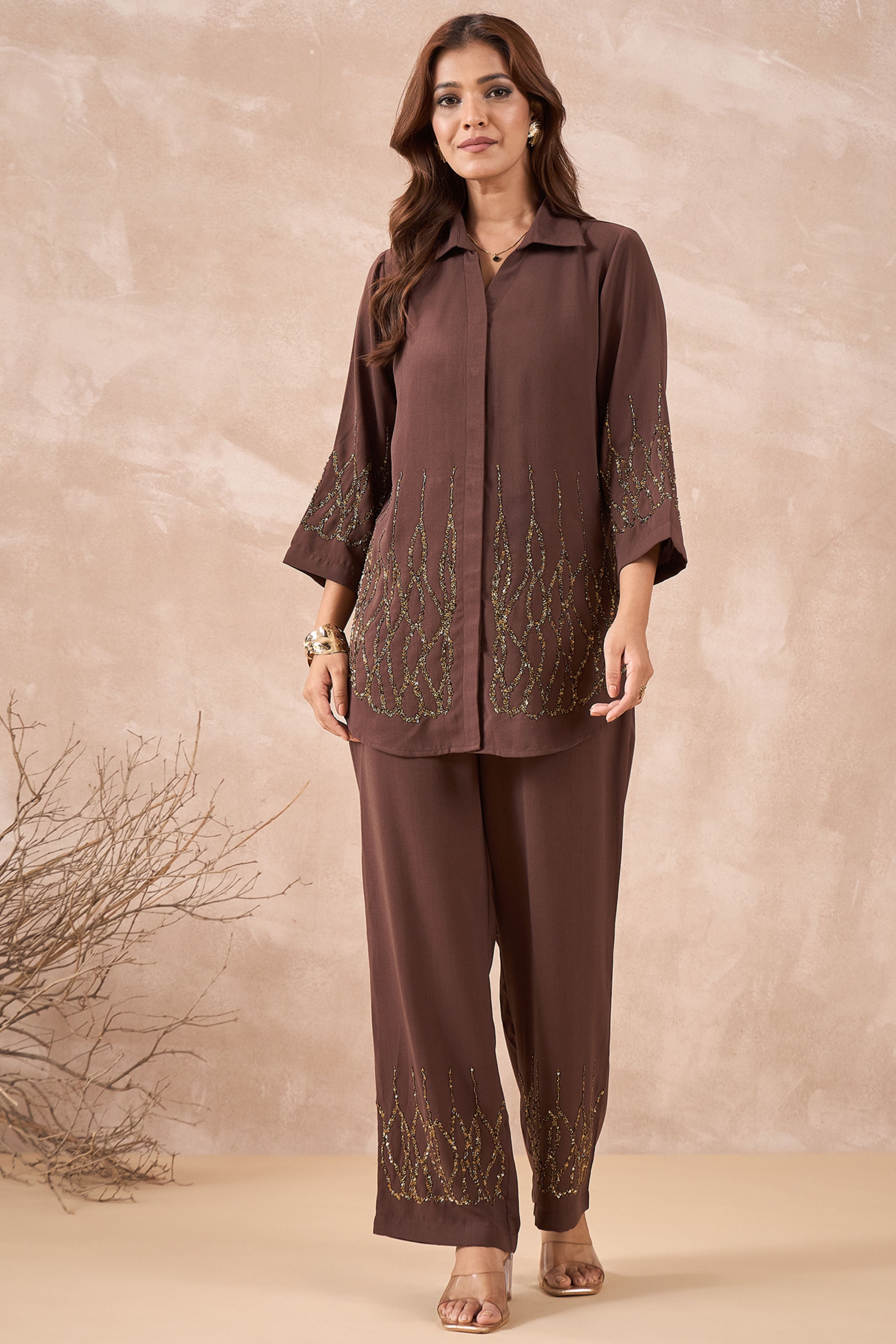 Turn heads with this Brown Embellished Co-Ord Set. Made from soft and comfy fabric, it has beautiful contrast embellishment that gives it a rich and festive look—great for family events, small parties, or stylish daily wear.