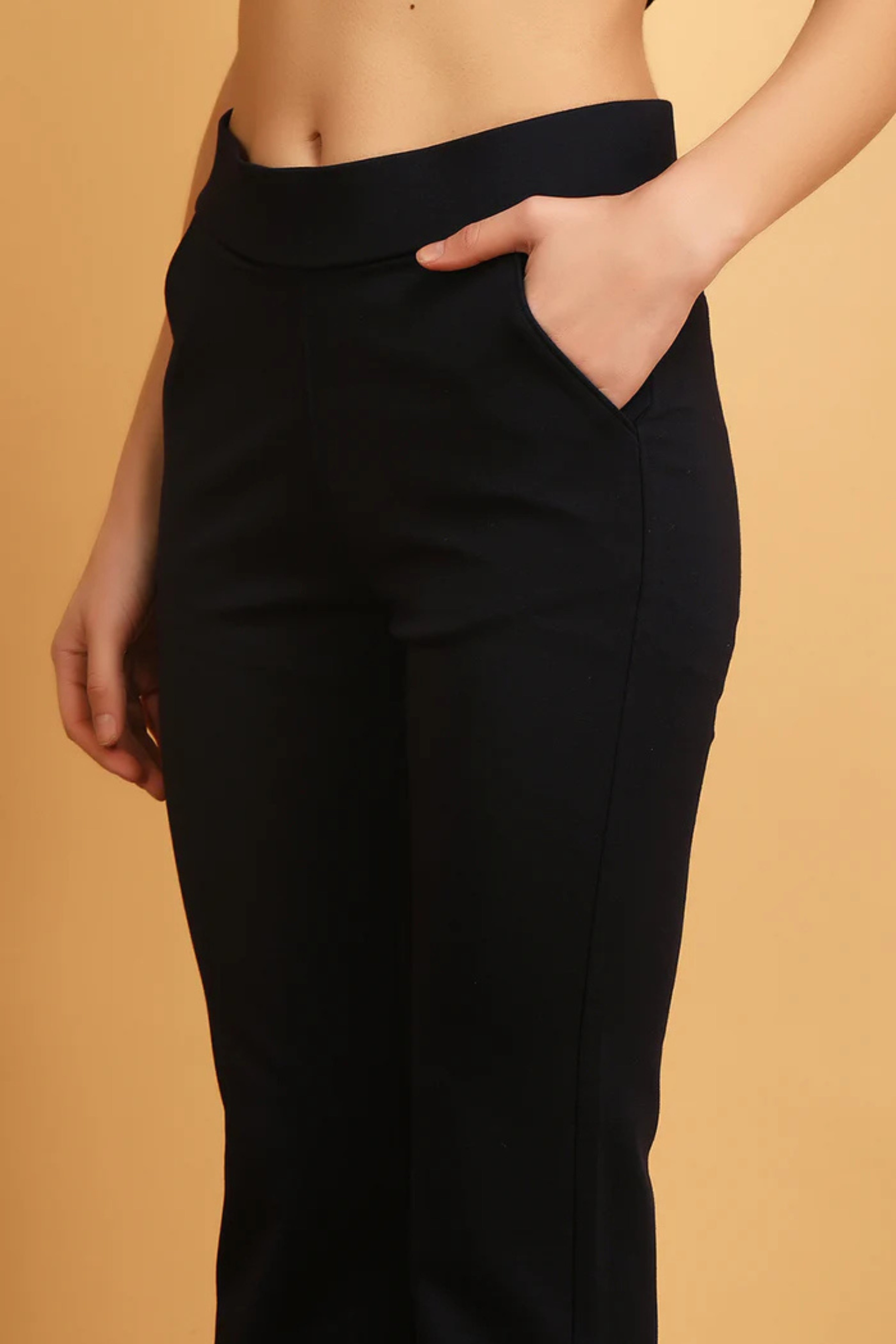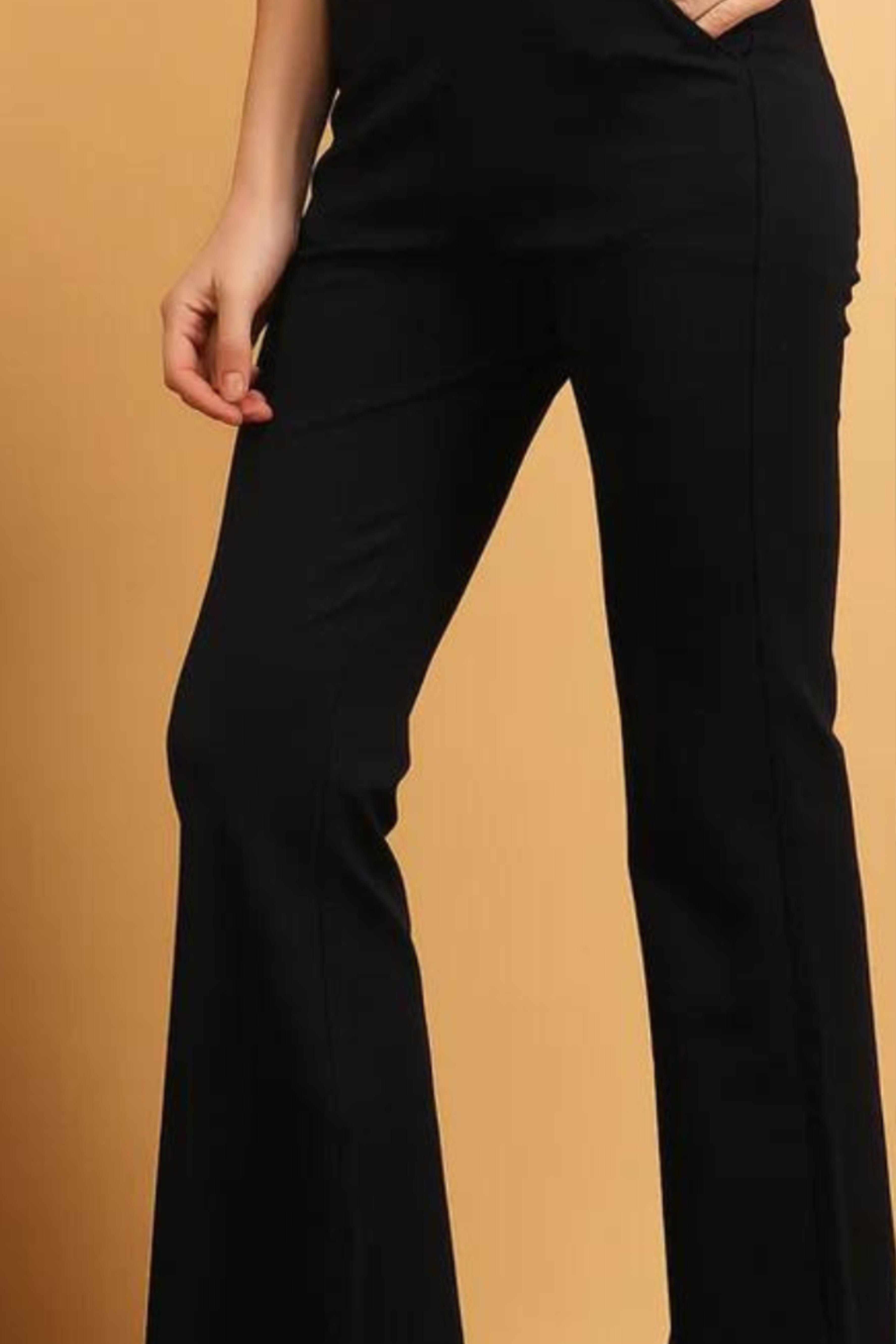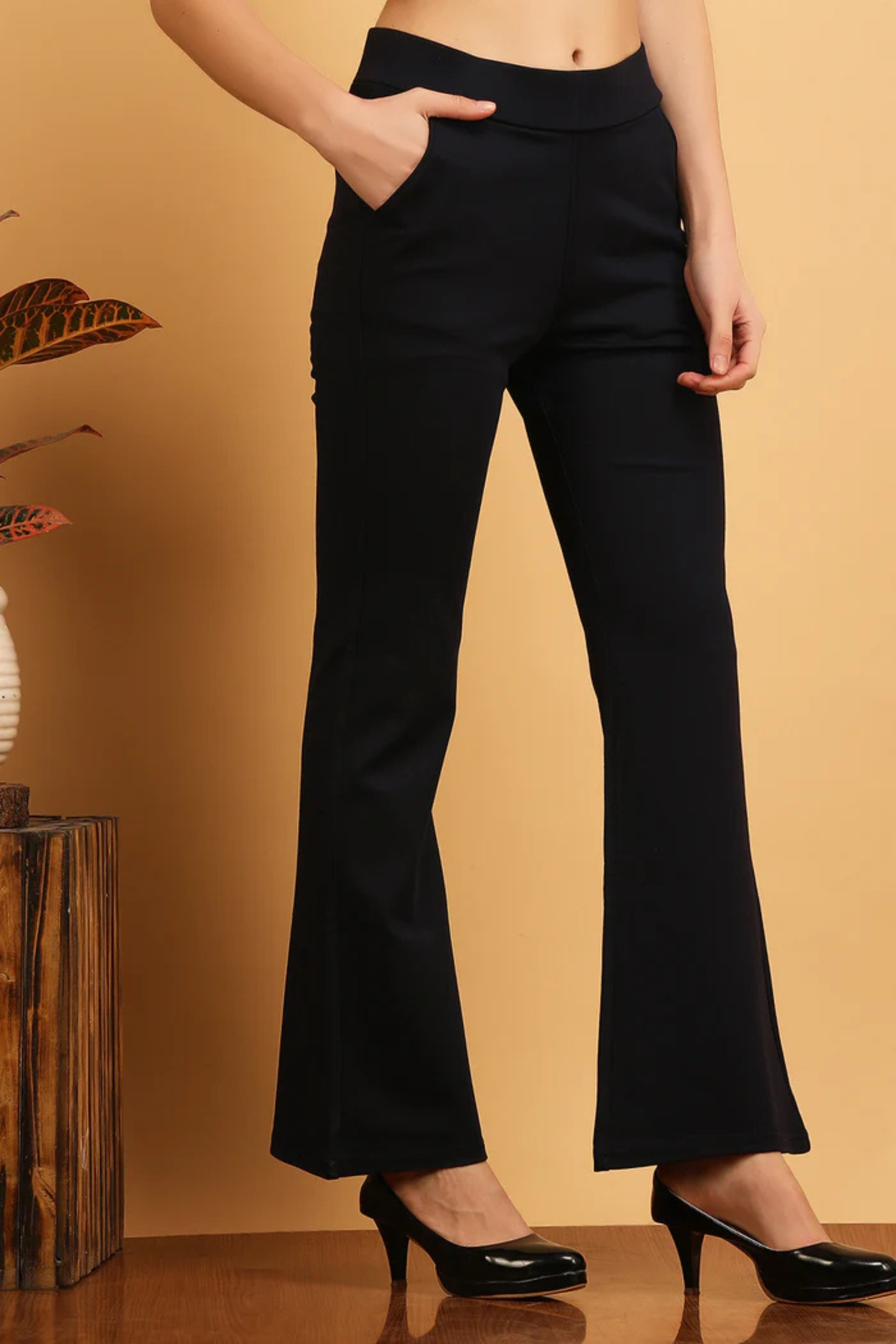 A classic bell-bottom pant in a cotton-lycra mix fabric, featuring an elastic waistband for comfort. This versatile piece is suitable for wear throughout the year. The bell-bottom design includes a stylish slit, providing a taller and slimmer appearance.