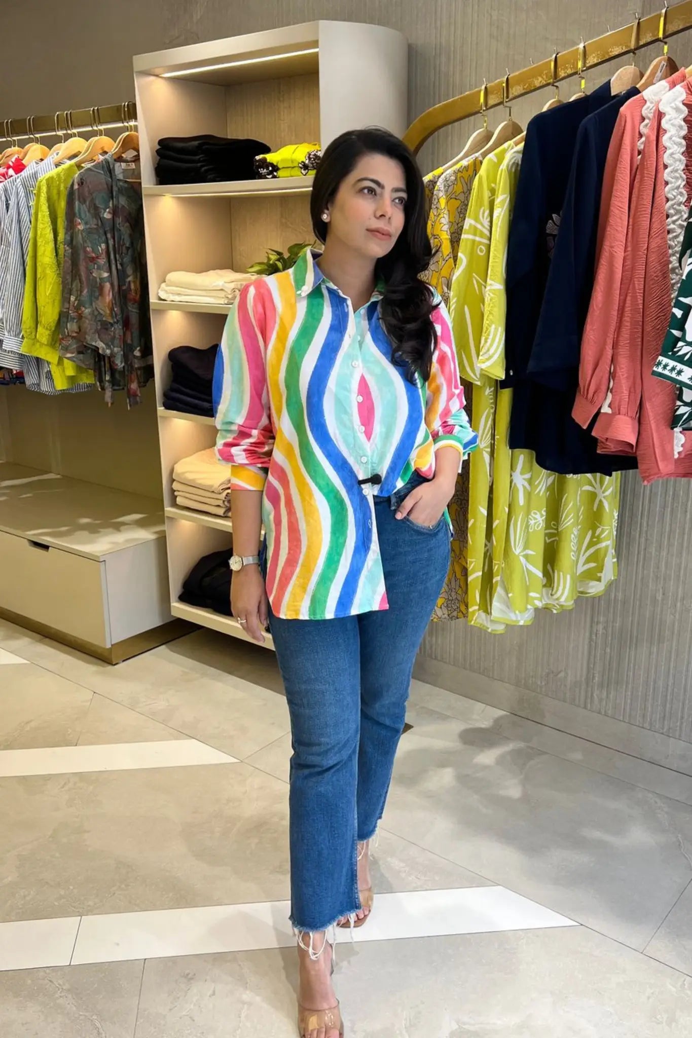 Our Multicolor Cotton Poplin Shirt made from super soft cotton poplin fabric. This vibrant shirt features a lively, Multicolor print that add a modern twist. The playful design pairs effortlessly with blue denim, elevating the shirt’s look and adding a touch of fun to your outfit.