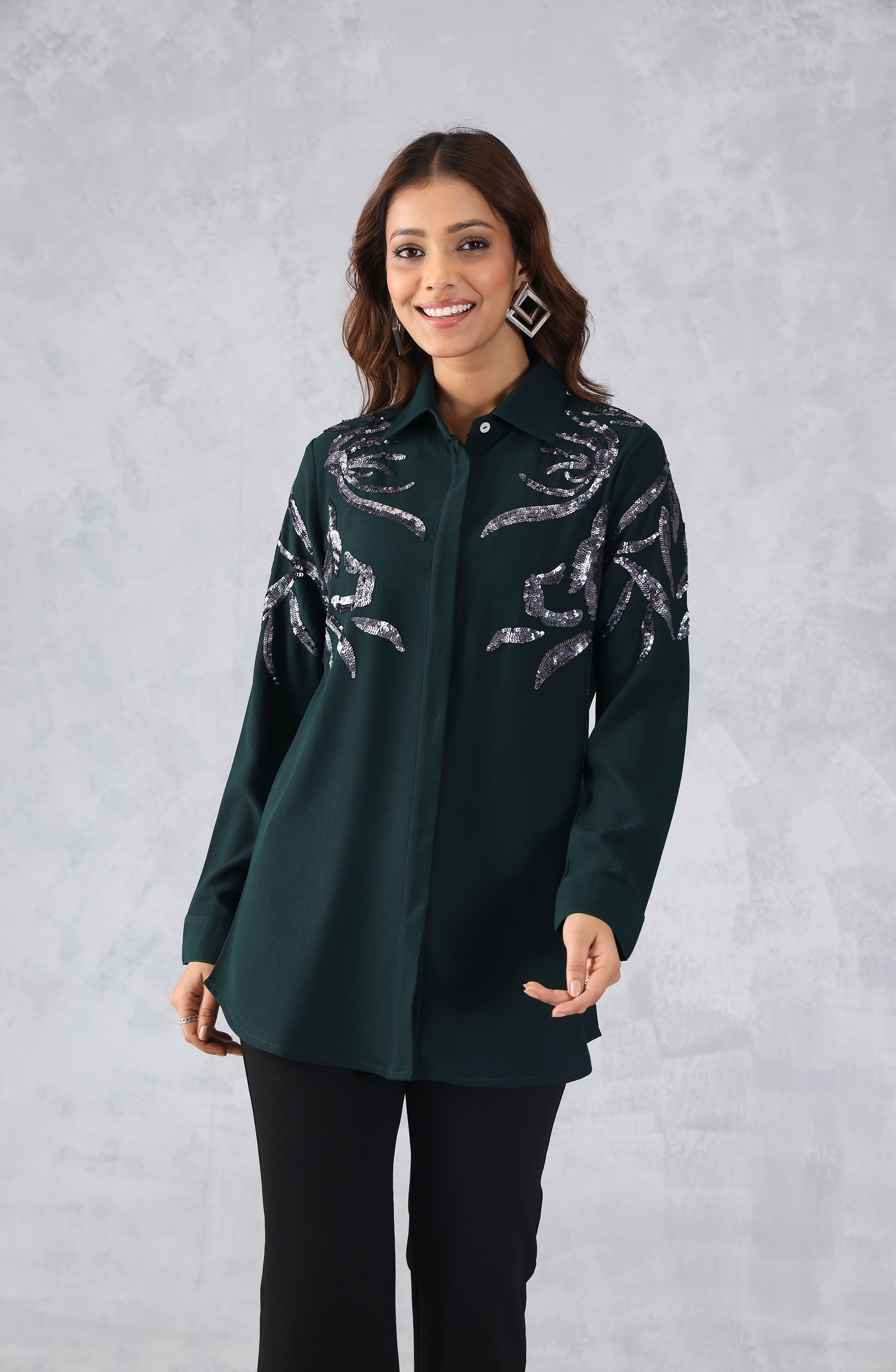 ASHIN’s dark green sequin shirt features subtle shimmer detailing on a smooth, comfortable fit. Perfect for office parties, evening outings, and semi-formal wear, it adds a classy sparkle while keeping your look elegant and easy to style.