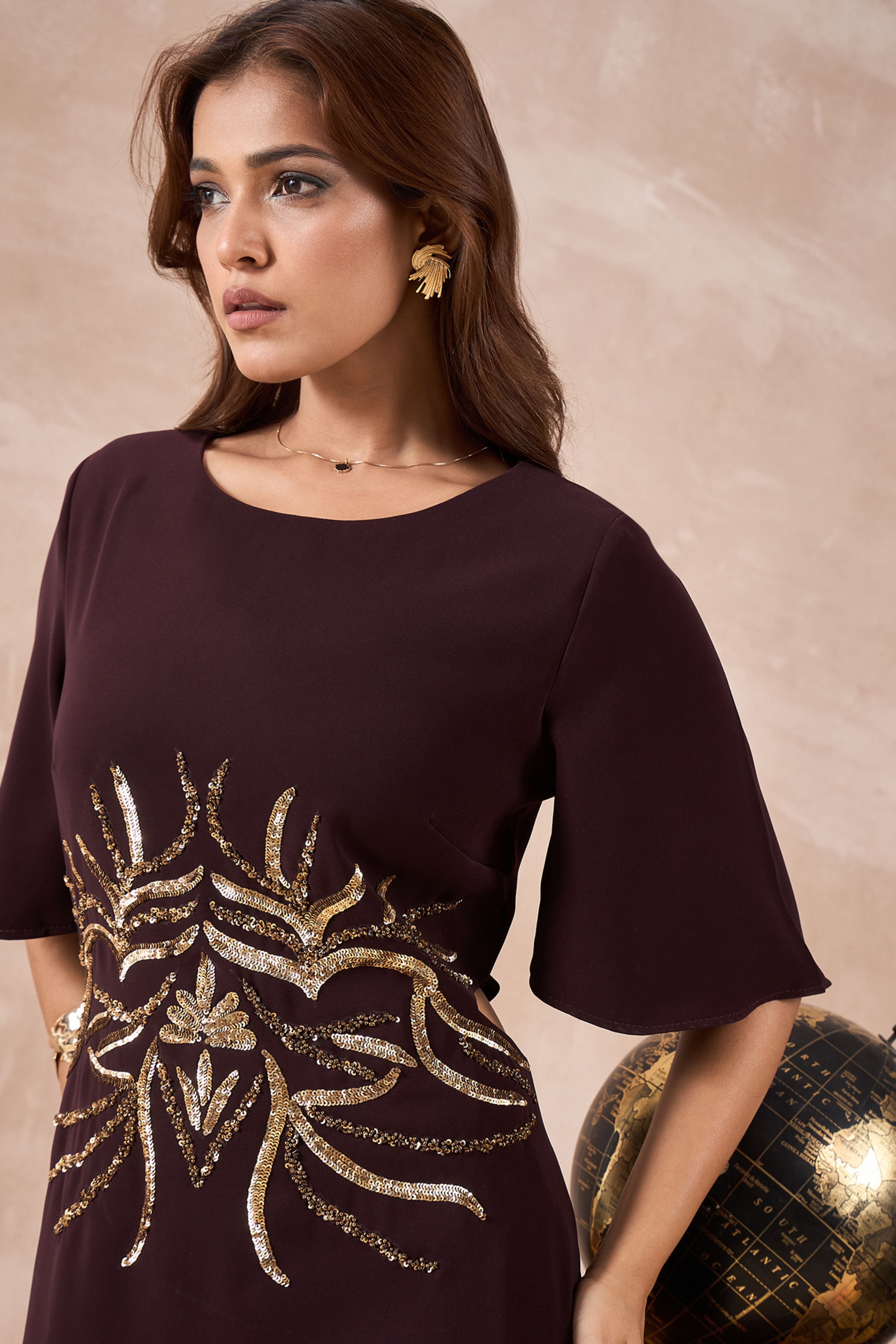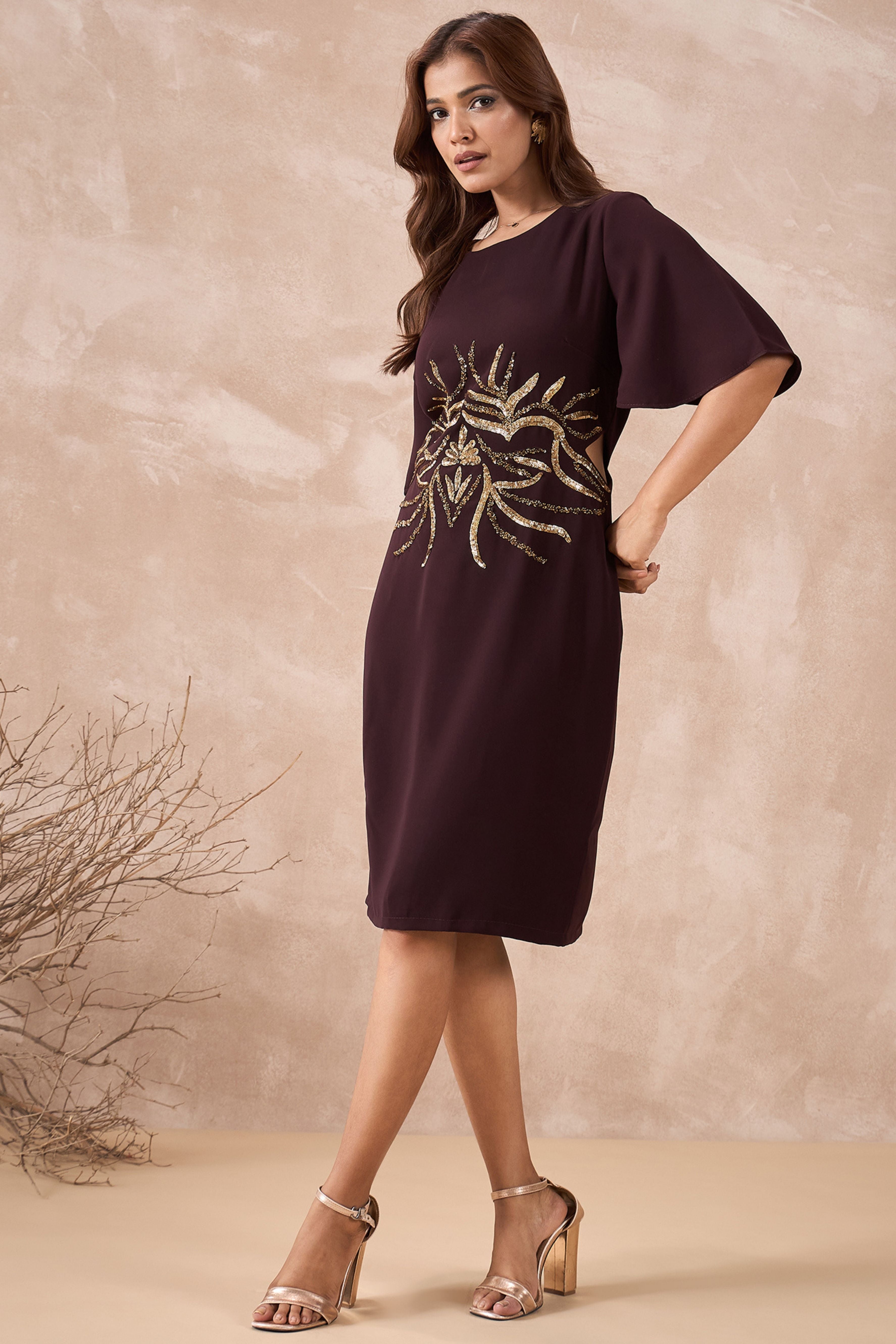 This elegant maroon dress has beautiful golden work around the waist that adds a touch of sparkle. It’s knee-length, super stylish, and perfect to wear for parties, weddings, or any special evening event.