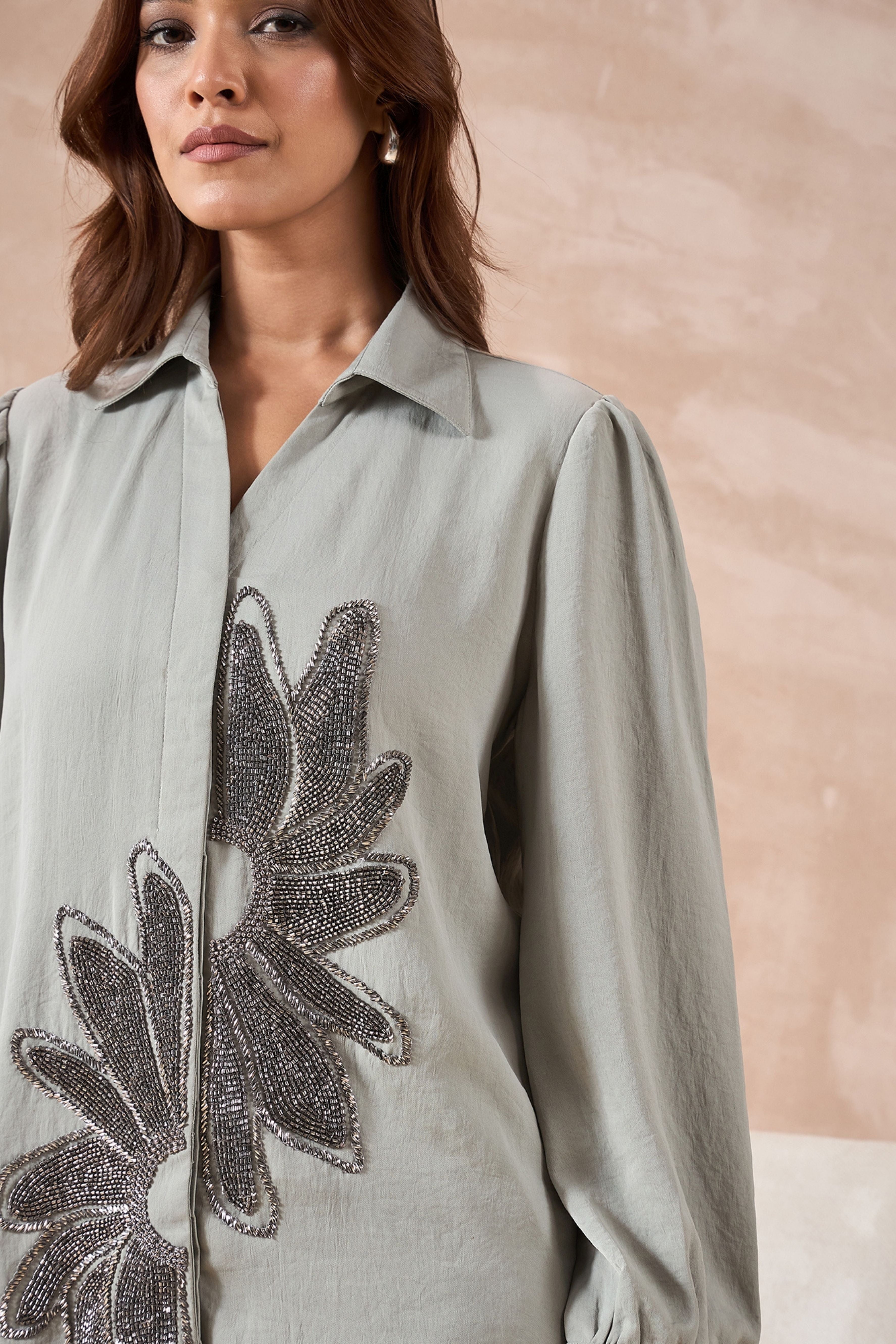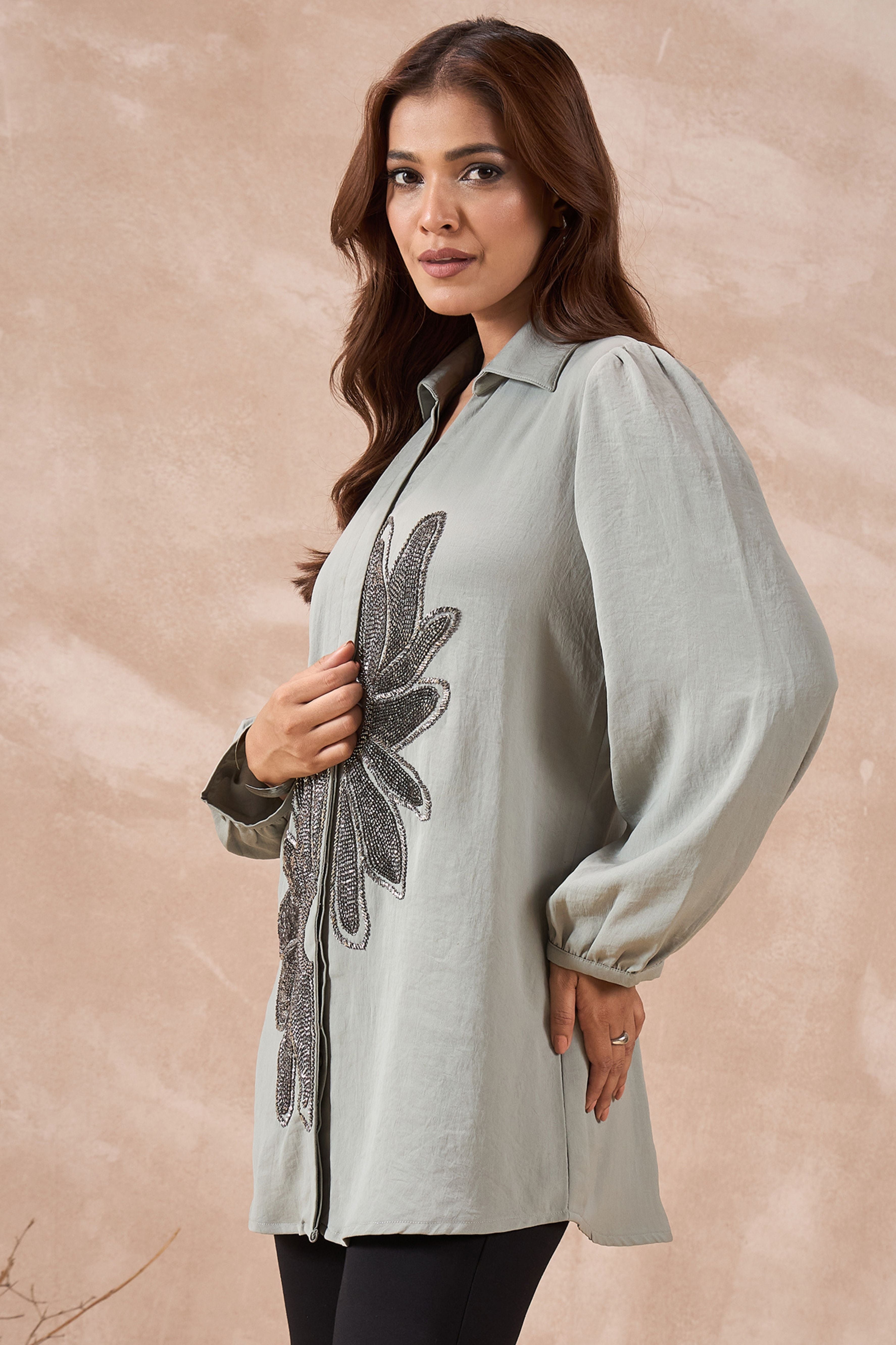 This Grey Shirt is super soft and comfy with beautiful floral embellishment in the front. You can wear it to work, a lunch date, or a family dinner. It’s simple, classy, and makes you feel dressed up.