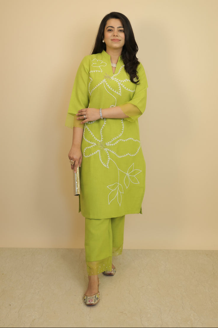 This lime green kurta set has pretty white floral embroidery and sheer detailing on the pants. It’s made from soft and breathable fabric, making it perfect to wear for small functions, casual outings, or festive get-togethers.