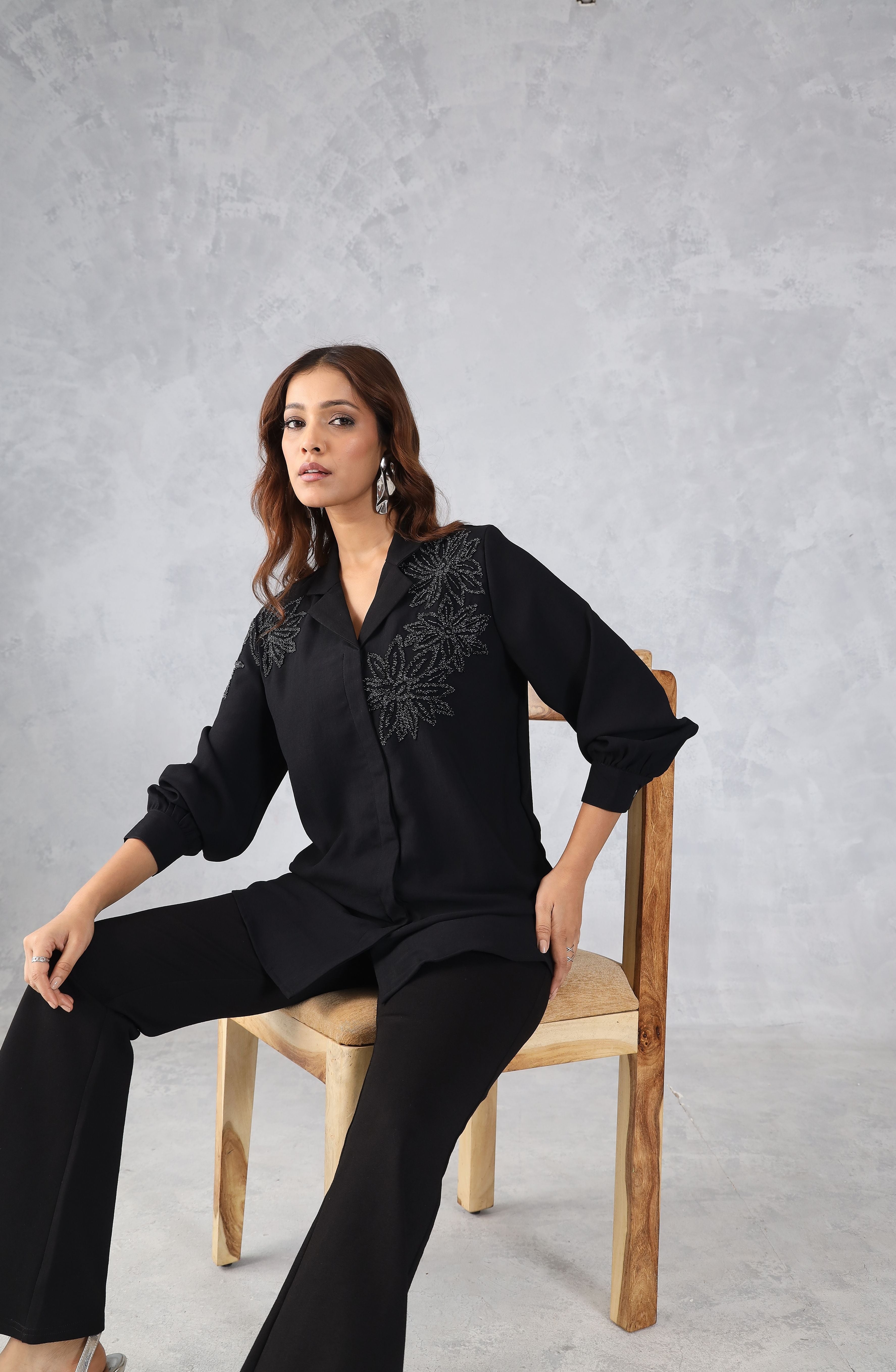ASHIN’s Midnight Bloom black floral embellished shirt features delicate hand detailing on a sleek, comfortable fit. Perfect for semi-formal outings, dinner dates, and evening wear, it gives an elegant look while keeping you relaxed and stylish all day.