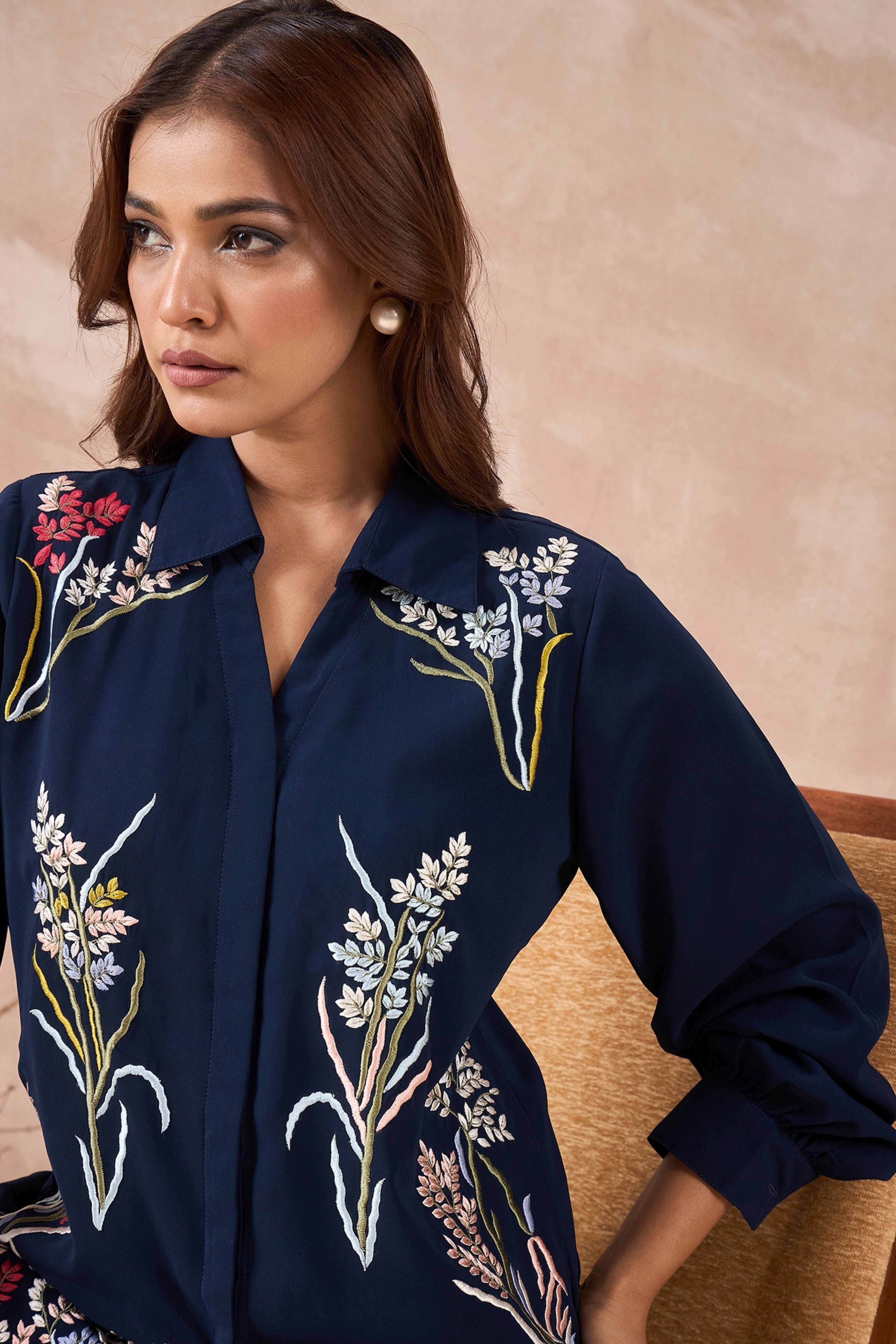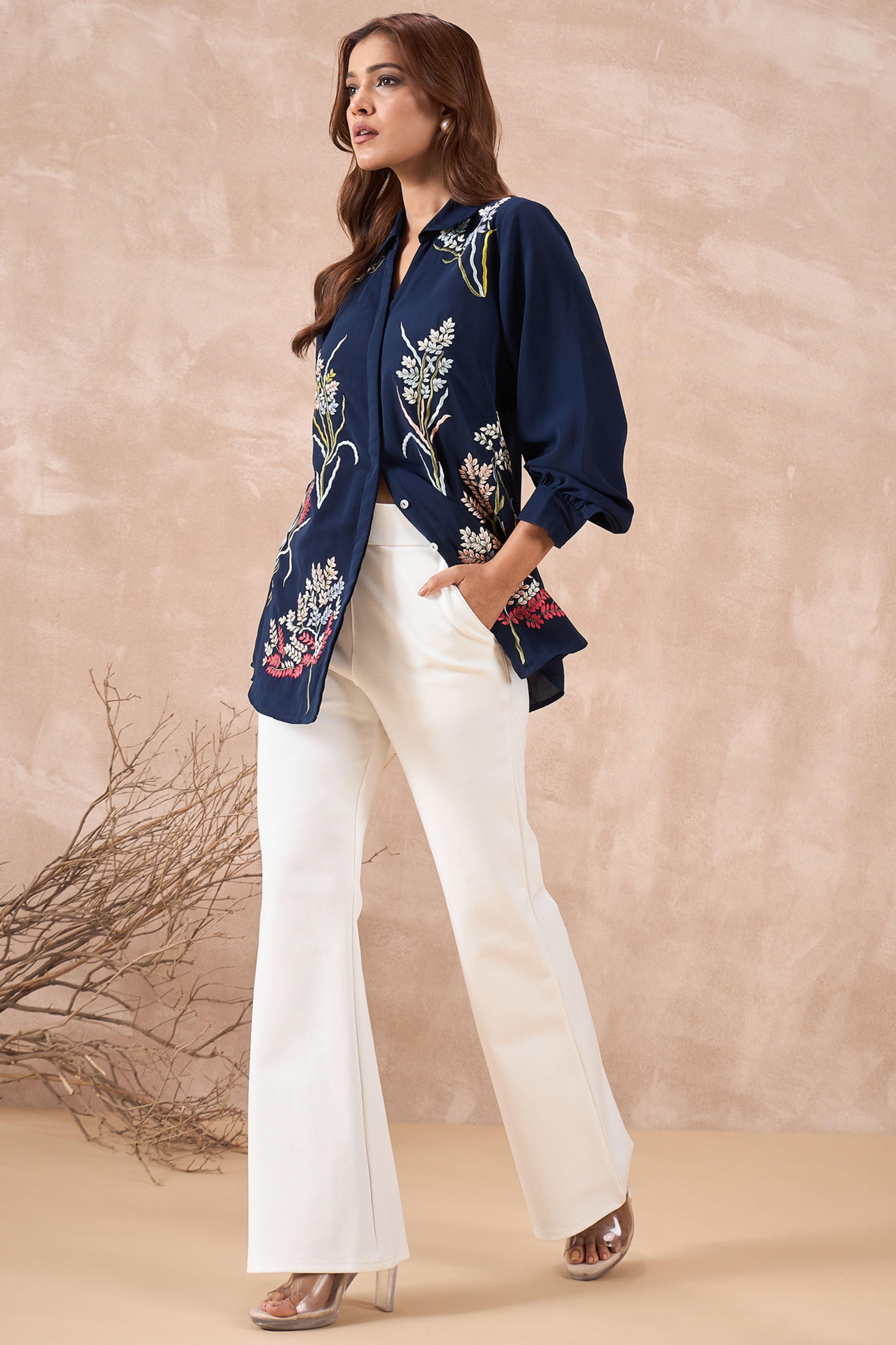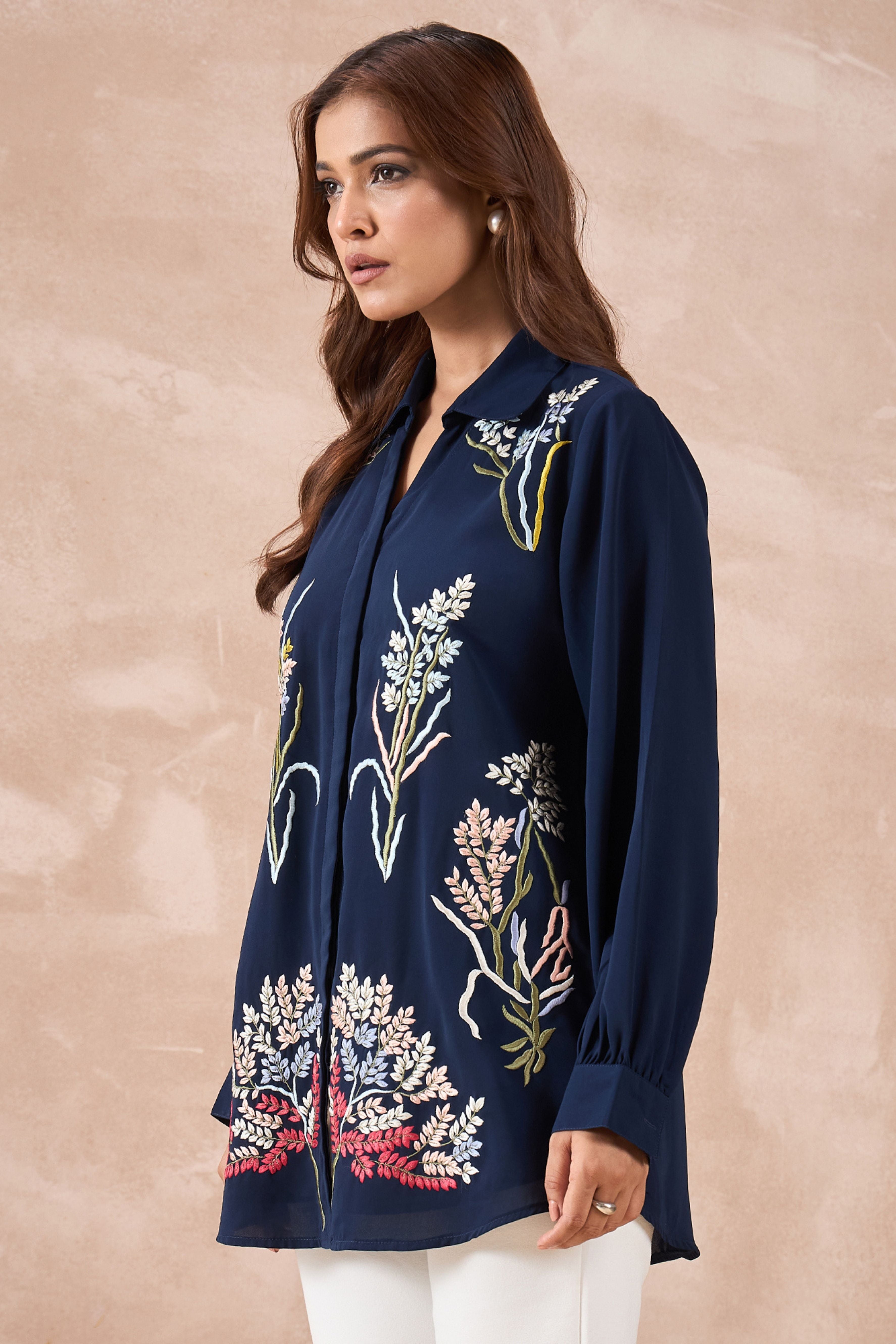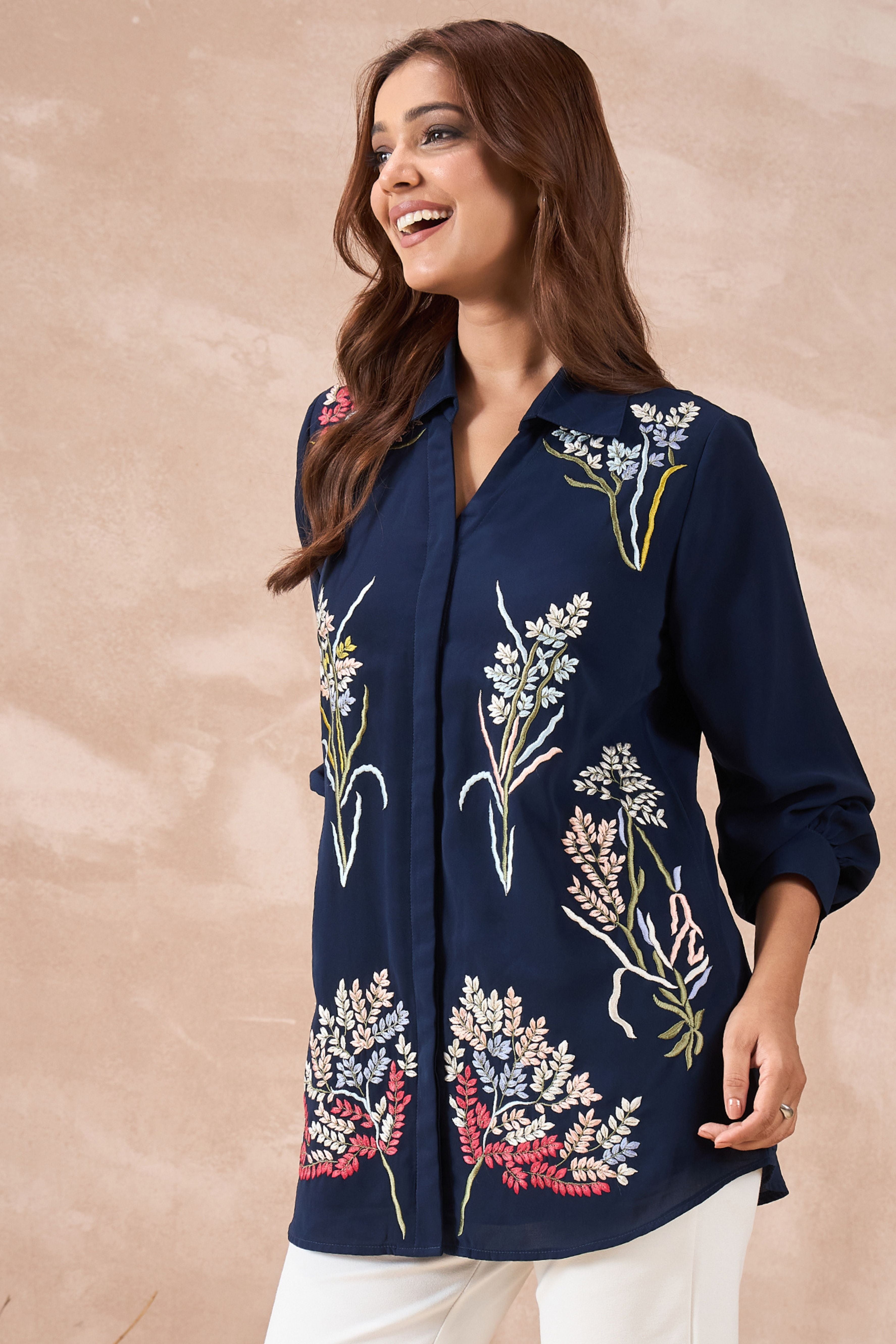 Stand out in style with this Navy Blue Floral Embroidered Shirt. Made from soft and comfy fabric, it has beautiful flower embroidery all over, making it perfect for festivals, office, or even a casual day out.