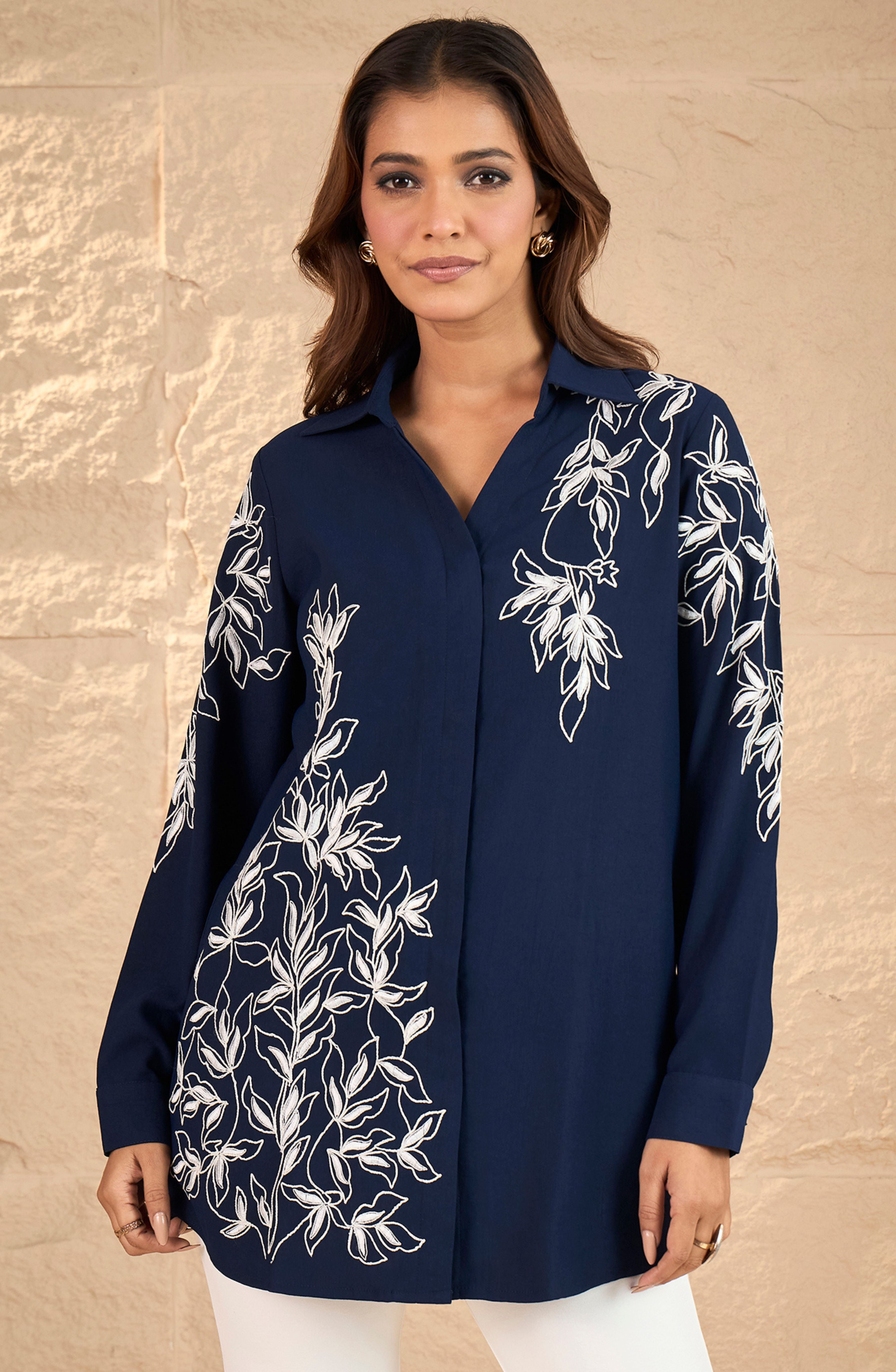 This navy blue georgette rayon co-ord set is crafted to be your go-to outfit for any season. The set features a sophisticated belt and elegant sleeves, while the front panel is adorned with intricate work that adds a touch of refinement and on front and on sleeves. Its classic co-ord set and crush free fabric and can be wear all year. Perfect for achieving a polished semi-formal look, this co-ord set effortlessly blends style and comfort.