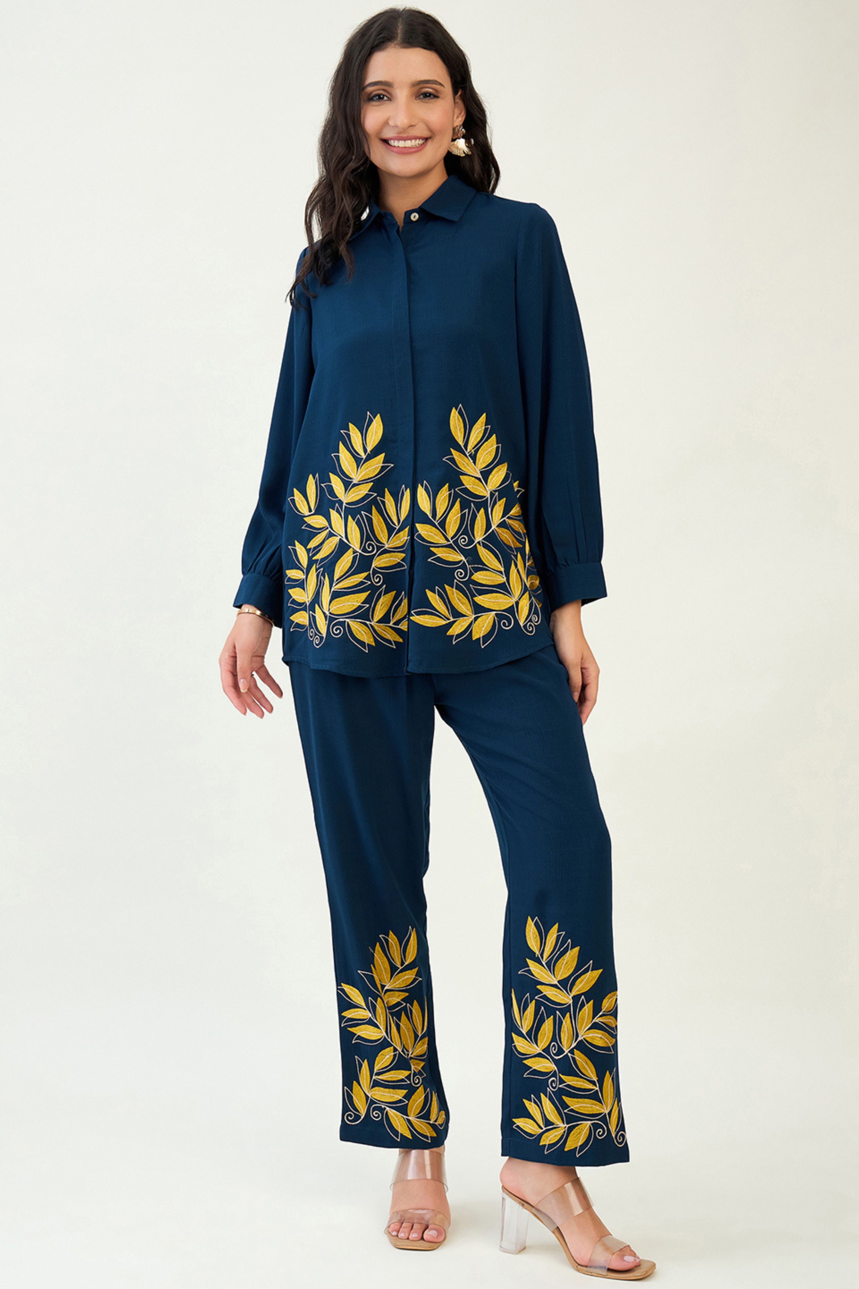 Elevate your wardrobe with our Navy Blue Co-ord Set, expertly crafted from luxurious georgette rayon fabric. This sophisticated ensemble features intricate embroidery on the sleeves and a striking contrast of mustard color embroidery on the front and pants, adding a touch of elegance to the overall design. The thoughtful detailing and comfortable fit ensure you look effortlessly refined and stylish, whether you're attending a special occasion or simply elevating your everyday look.
