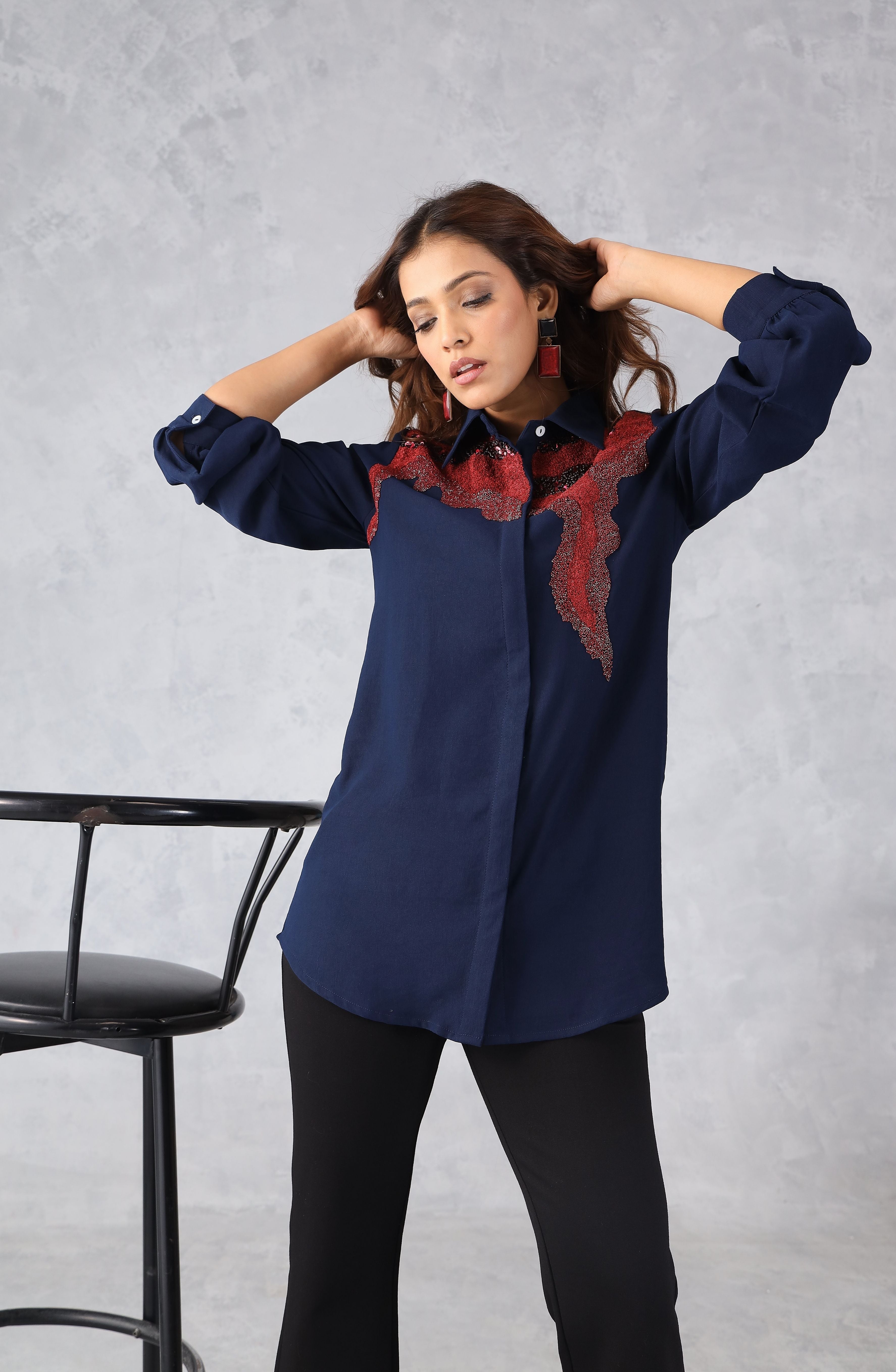 ASHIN’s navy blue and red abstract embellished shirt features eye-catching hand detailing on a comfortable, flattering fit. Ideal for office wear, semi-formal outings, and evening dinners, it adds a bold yet elegant touch to your everyday wardrobe.