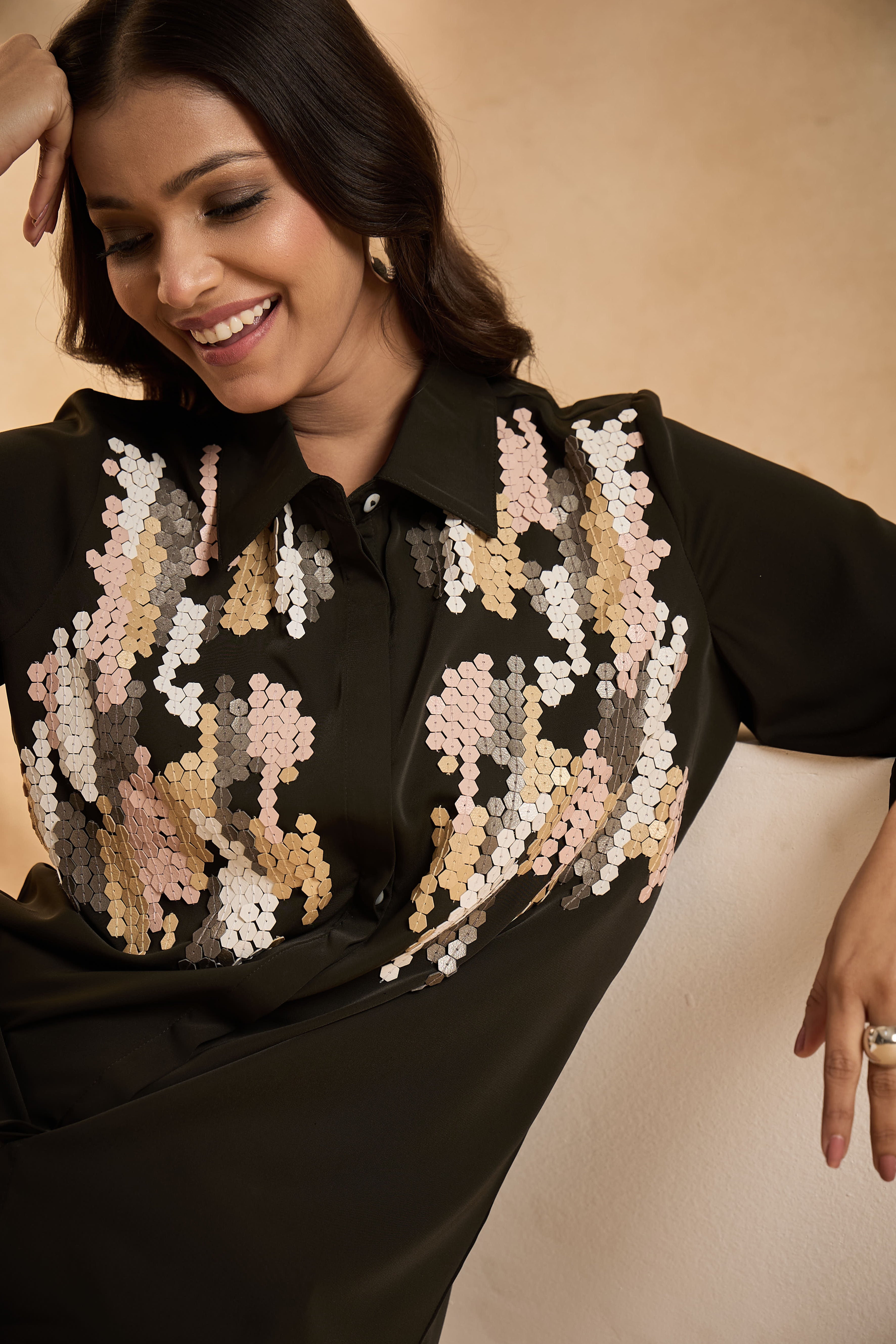 Shine in this Olive spark shirt featuring multicolor sequin embellishments, a classic button-down design, and long sleeves. Perfect for party wear, evening outfits, and festive fashion, adding a touch of elegance and glamour. ✨