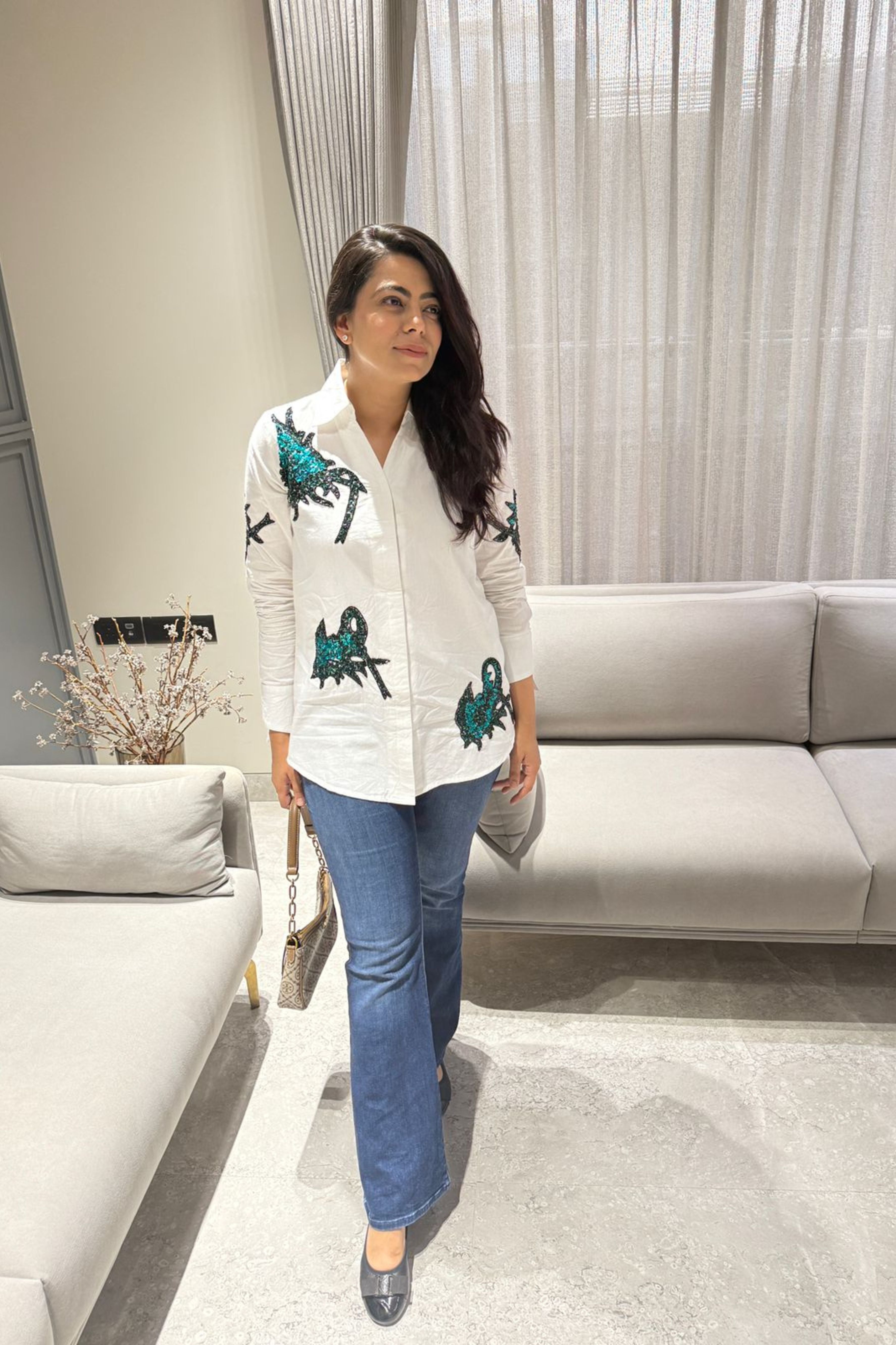 This white shirt has cool shiny green and black designs that make it stand out. It’s perfect for a fun day out or a casual party. Super comfy to wear and adds a trendy touch to your look.