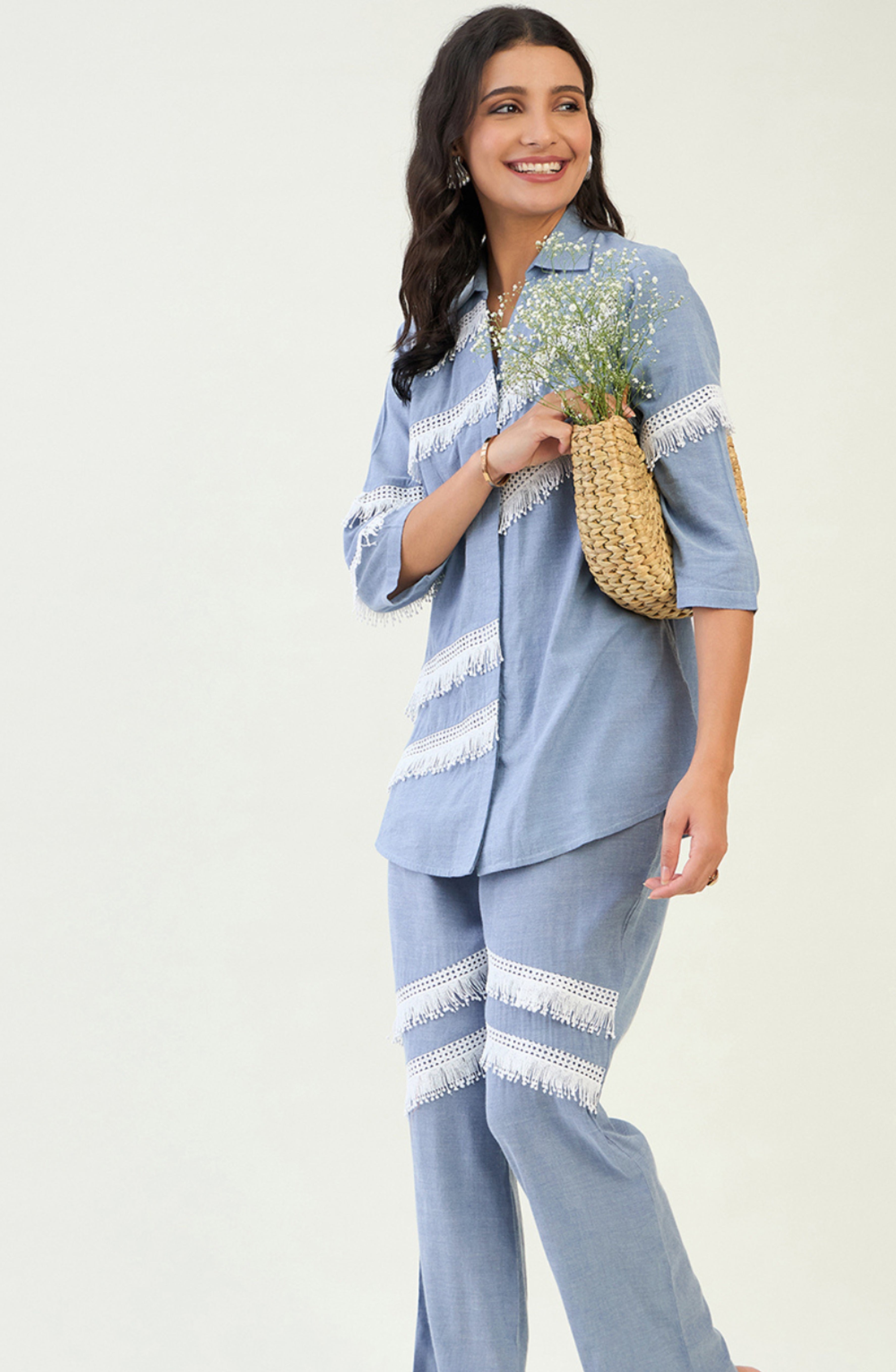 Elevate your style with our Denim Lace Co-ord Set, crafted from ultra-soft cotton denim fabric for a luxurious feel. This elegant ensemble is adorned with delicate lace work on the pants, front and sleeves, adding a touch of intricate beauty to the classic denim look. Designed for both comfort and sophistication, this co-ord set is perfect for making a stylish statement at any occasion, blending timeless charm with modern elegance.