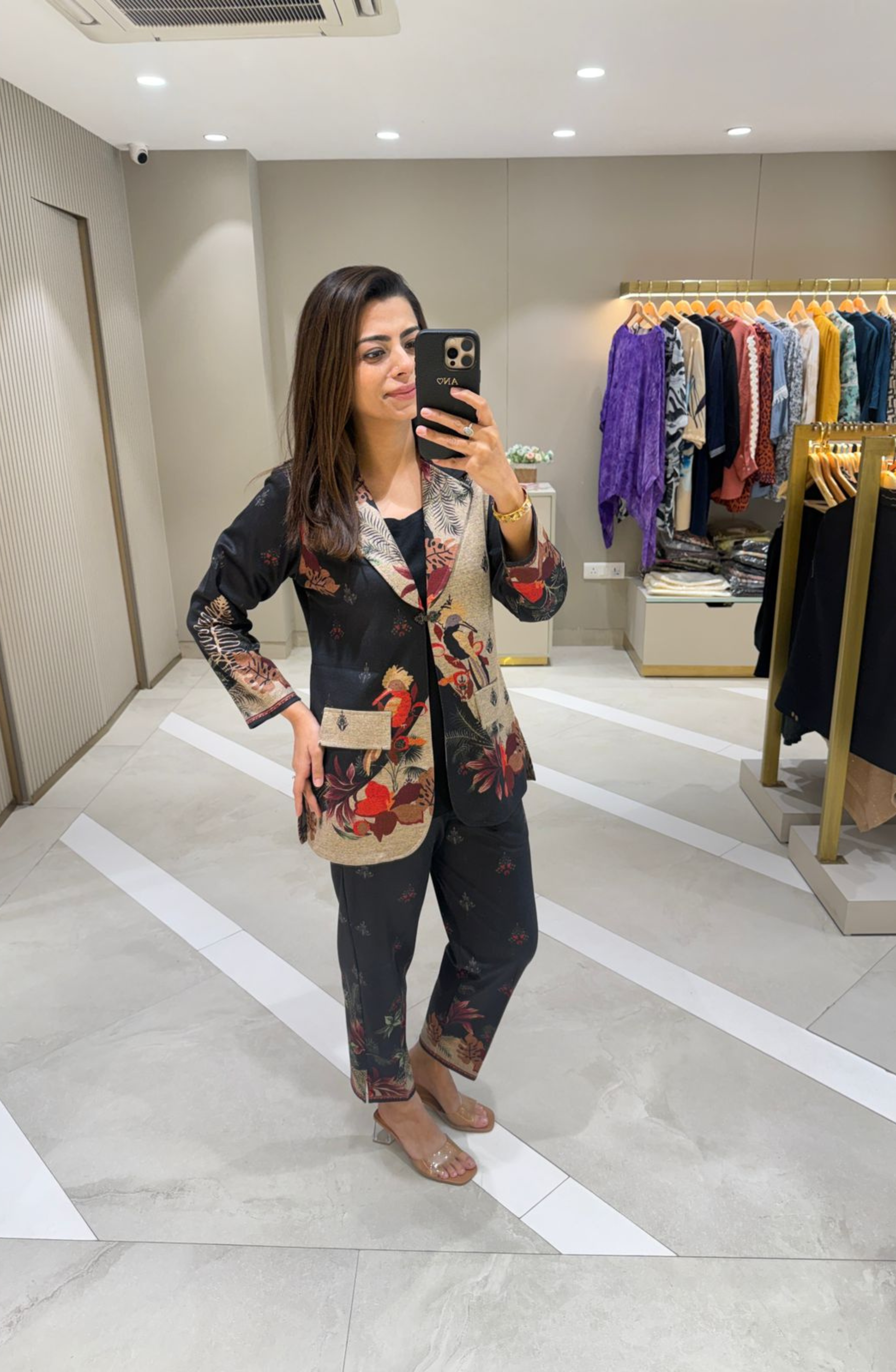 This Woolen Floral Blazer Style Co-Ord Set is perfect for winter, offering warmth with a premium designer look. The soft woolen fabric, elegant floral print, and matching pants create a stylish, comfortable, and ready-to-wear outfit for any occasion.